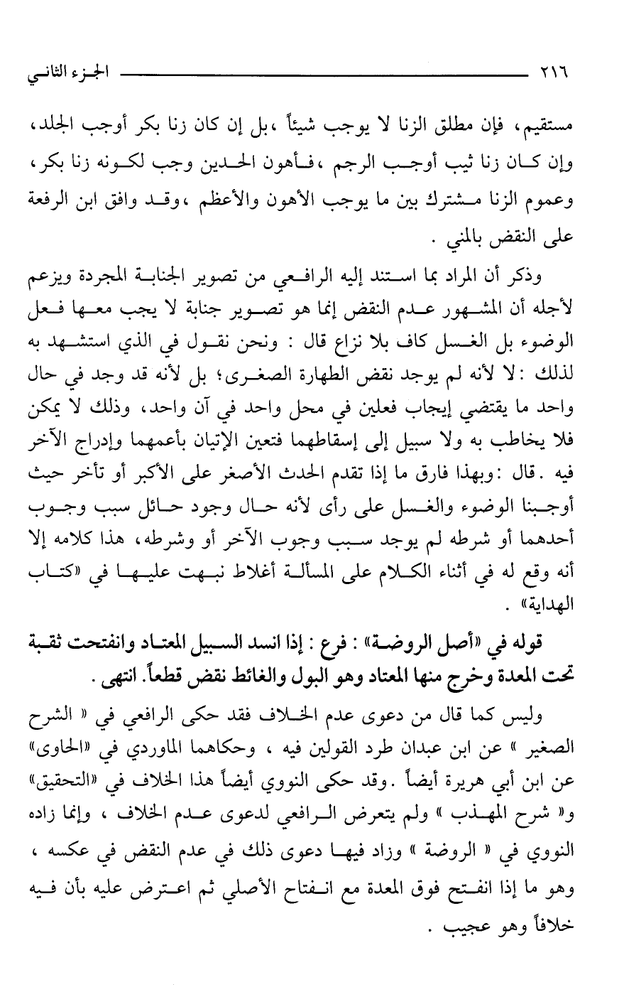 وذكر أن المراد بما استند إليه الرافعي من تصوير الجنابة المجردة ويزعم لأجله أن المشهور عدم النقض إنما هو تصوير جنابة لا يجب معها فعل الوضوء بل الغسل كاف بلا نزاع قال: ونحن نقول في الذي استشهد به لذلك: لا لأنه لم يوجد نقض الطهارة الصغرى؛ بل لأنه قد وجد في حال واحد ما يقتضي إيجاب فعلين في محل واحد في آن واحد، وذلك لا يمكن فلا يخاطب به ولا سبيل إلى إسقاطهما فتعين الإتيان بأعمهما وإدراج الآخر فيه. قال: وبهذا فارق ما إذا تقدم الحدث الأصغر على الأكبر أو تأخر حيث أوجبنا الوضوء والغسل على رأى لأنه حال وجود حائل سبب وجوب أحدهما أو شرطه لم يوجد سبب وجوب الآخر أو وشرطه، هذا كلامه إلا أنه وقع له في أثناء الكلام على المسألة أغلاط نبهت عليها في "كتاب الهداية".