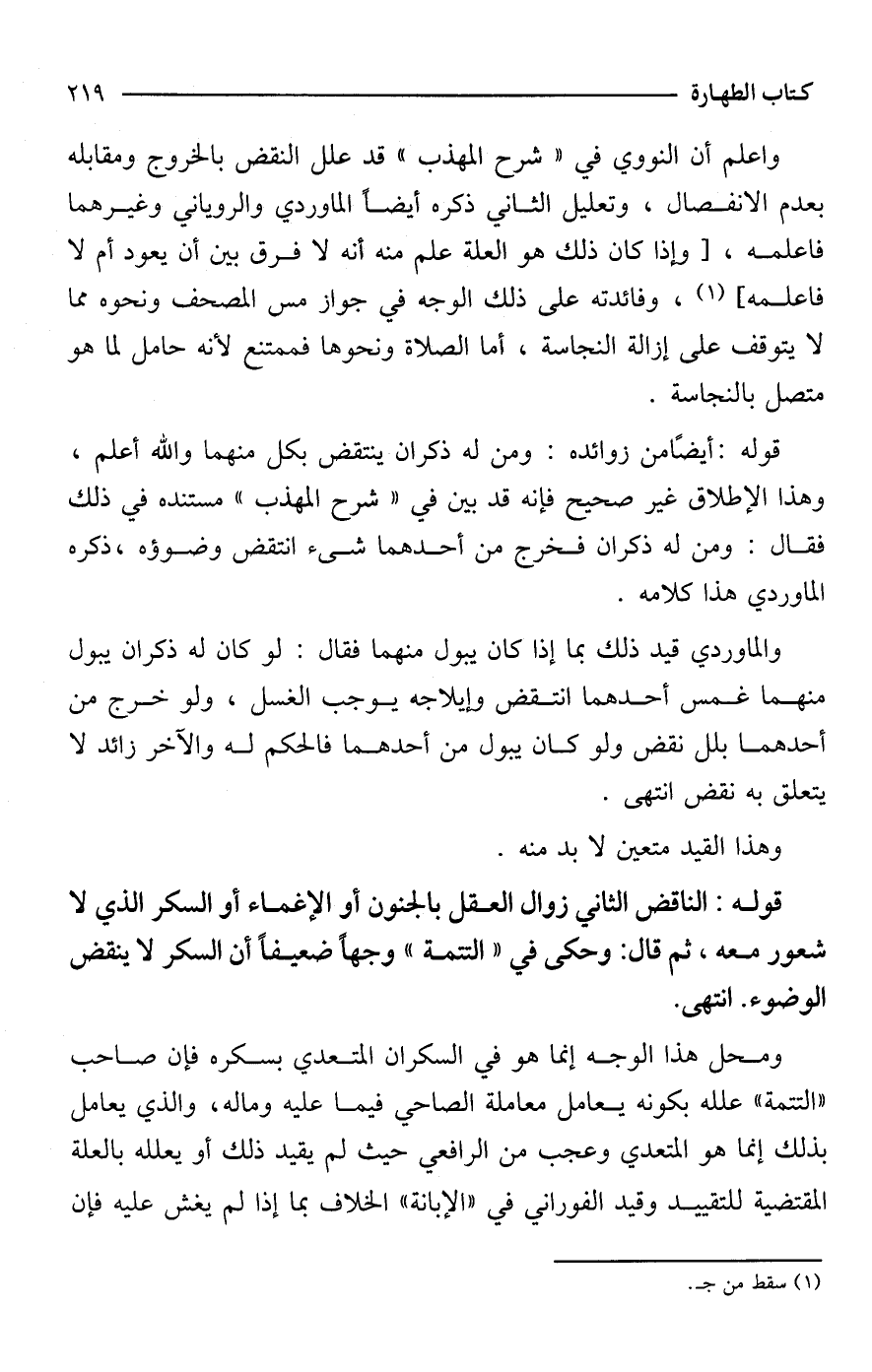 واعلم أن النووي في "شرح المهذب" قد علل النقض بالخروج ومقابله بعدم الانفصال، وتعليل الثانى ذكره أيضًا الماوردي والروياني وغيرهما فاعلمه، [وإذا كان ذلك هو العلة علم منه أنه لا فرق بين أن يعود أم لا فاعلمه] (¬1)، وفائدته على ذلك الوجه في جواز مس المصحف ونحوه مما لا يتوقف على إزالة النجاسة، أما الصلاة ونحوها فممتنع لأنه حامل لما هو متصل بالنجاسة.
