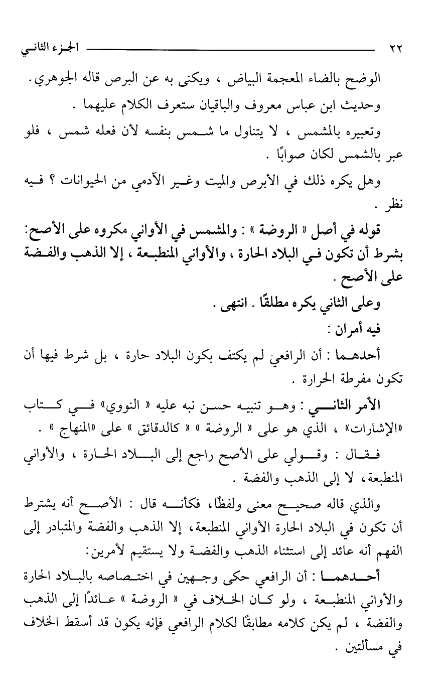 أحدهما: أن الرافعي حكى وجهين في اختصاصه بالبلاد الحارة والأواني المنطبعة، ولو كان الخلاف في "الروضة" عائدًا إلى الذهب والفضة، لم يكن كلامه مطابقًا لكلام الرافعي فإنه يكون قد أسقط الخلاف في مسألتين.