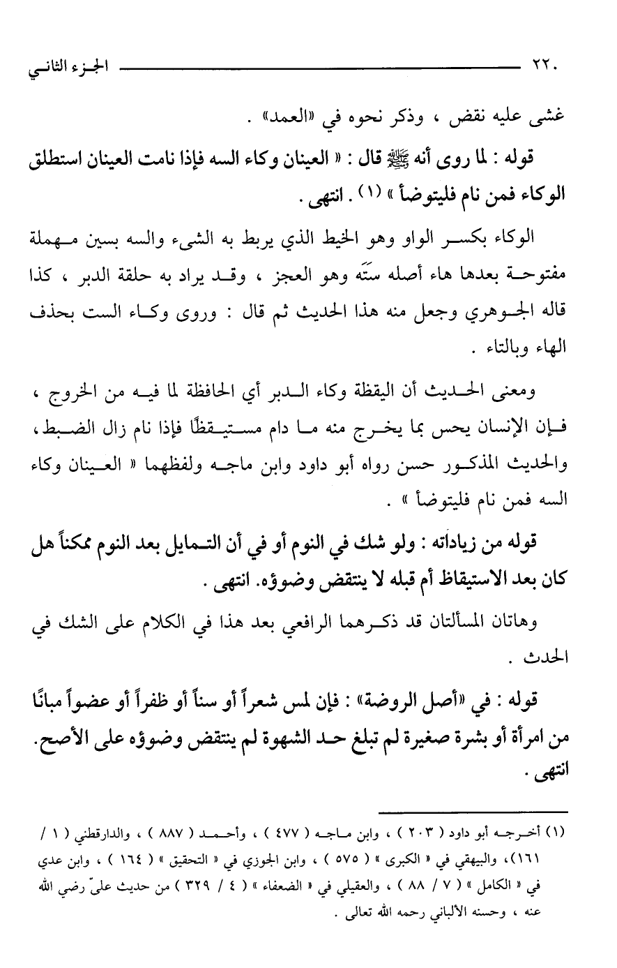 ومعنى الحديث أن اليقظة وكاء الدبر أي الحافظة لما فيه من الخروج، فإن الإنسان يحس بما يخرج منه ما دام مستيقظًا فإذا نام زال الضبط، والحديث المذكور حسن رواه أبو داود وابن ماجه ولفظهما "العينان وكاء السه فمن نام فليتوضأ".