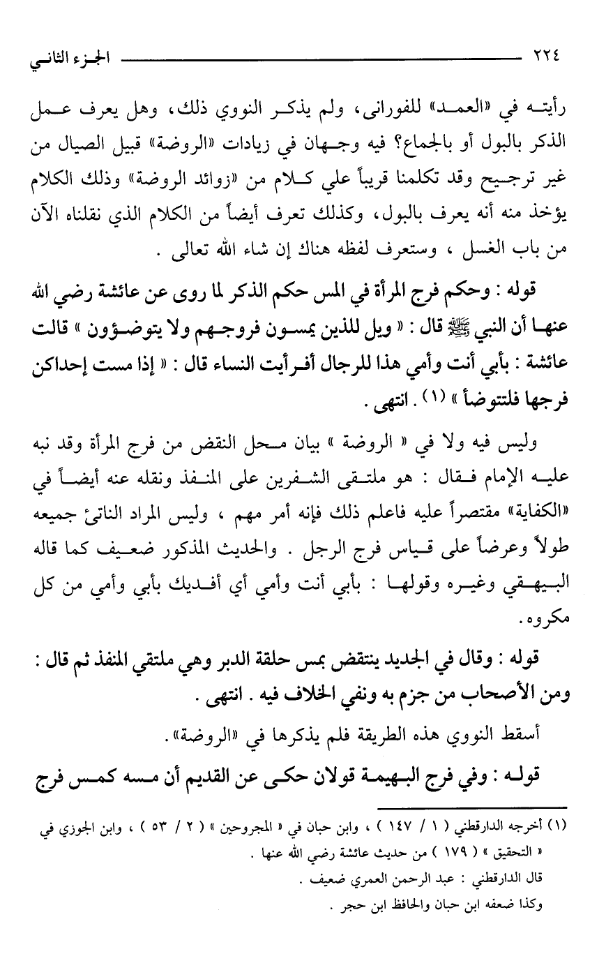 وليس فيه ولا في "الروضة" بيان محل النقض من فرج المرأة وقد نبه عليه الإمام فقال: هو ملتقى الشفرين على المنفذ ونقله عنه أيضًا في "الكفاية" مقتصرًا عليه فاعلم ذلك فإنه أمر مهم، وليس المراد الناتئ جميعه طولًا وعرضًا على قياس فرج الرجل. والحديث المذكور ضعيف كما قاله البيهقي وغيره وقولها: بأبي أنت وأمي أي أفديك بأبي وأمي من كل مكروه.
