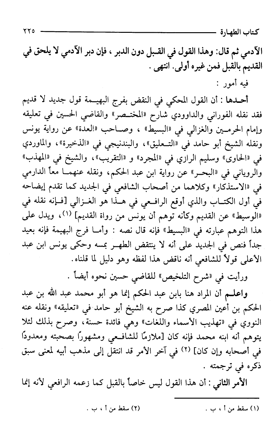 أحدهما: أن القول المحكي في النقض بفرج البهيمة قول جديد لا قديم فقد نقله الفوراني والداوودي شارح "المختصر" والقاضي الحسين في تعليقه وإمام الحرمين والغزالي في "البسيط"، وصاحب "العدة" عن رواية يونس ونقله الشيخ أبو حامد في "التعليق"، والبندنيجي في "الذخيرة"، والماوردي في "الحاوى" وسليم الرازي في "المجرد" و"التقريب"، والشيخ في "المهذب" والروياني في "البحر" عن رواية ابن عبد الحكم، ونقله عنهما معًا الدارمي في "الاستذكار" وكلاهما من أصحاب الشافعي في الجديد كما تقدم إيضاحه في أول الكتاب والذي أوقع الرافعي في هذا هو الغزالي [فإنه نقله في "الوسيط" عن القديم وكأنه توهم أن يونس من رواة القديم] (¬1)، ويدل على هذا التوهم عبارته في "البسيط" فإنه قال نصه: وأما فرج البهيمة فإنه بعيد جدًا فنص في الجديد على أنه لا ينتقض الطهر بمسه وحكى يونس ابن عبد الأعلى قولًا للشافعي أنه ناقض هذا لفظه وهو دليل لما قلناه.
