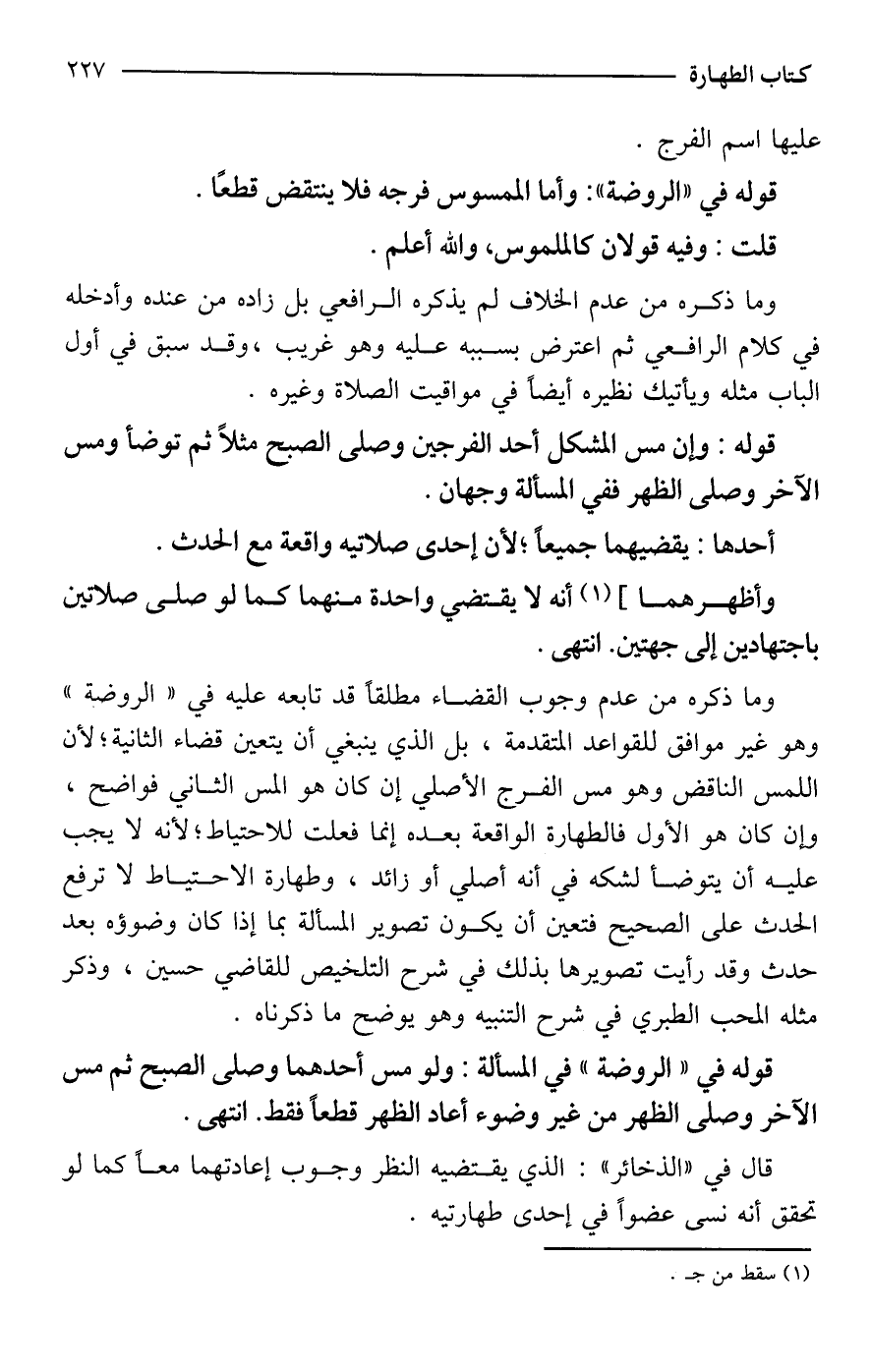 وما ذكره من عدم وجوب القضاء مطلقًا قد تابعه عليه في "الروضة" وهو غير موافق للقواعد المتقدمة، بل الذي ينبغي أن يتعين قضاء الثانية؛ لأن اللمس الناقض وهو مس الفرج الأصلي إن كان هو المس الثاني فواضح، وإن كان هو الأول فالطهارة الواقعة بعده إنما فعلت للاحتياط؛ لأنه لا يجب عليه أن يتوضأ لشكه في أنه أصلي أو زائد، وطهارة الاحتياط لا ترفع الحدث على الصحيح فتعين أن يكون تصوير المسألة بما إذا كان وضوؤه بعد حدث وقد رأيت تصويرها بذلك في شرح التلخيص للقاضي حسين، وذكر مثله المحب الطبري في شرح التنبيه وهو يوضح ما ذكرناه.
