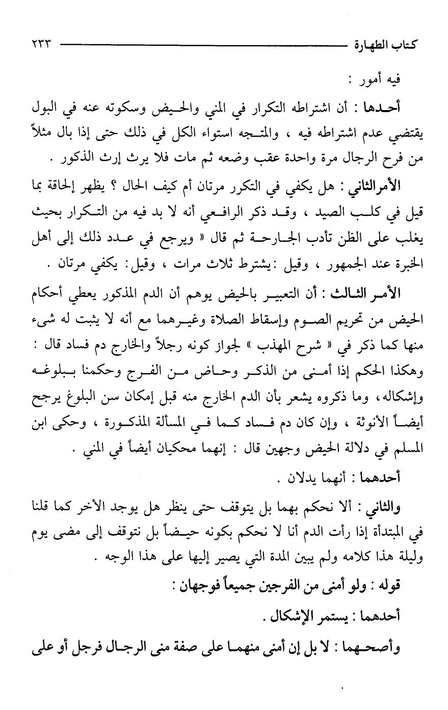 أحدها: أن اشتراطه التكرار في المني والحيض وسكوته عنه في البول يقتضي عدم اشتراطه فيه، والمتجه استواء الكل في ذلك حتى إذا بال مثلًا من فرج الرجال مرة واحدة عقب وضعه ثم مات فلا يرث إرث الذكور.