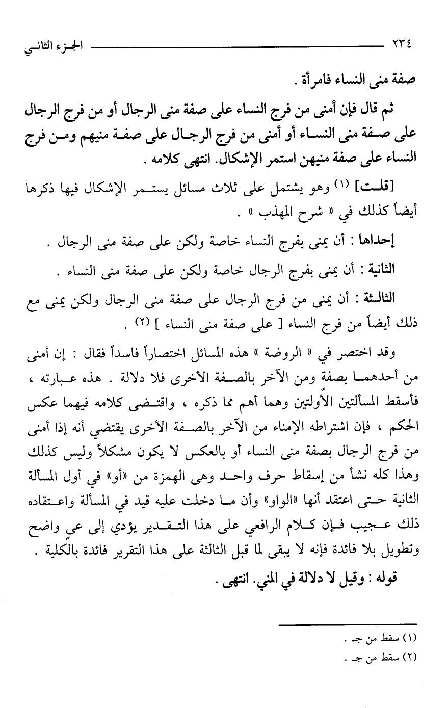 وقد اختصر في "الروضة" هذه المسائل اختصارًا فاسدًا فقال: إن أمنى من أحدهما بصفة ومن الآخر بالصفة الأخرى فلا دلالة. هذه عبارته، فأسقط المسألتين الأولتين وهما أهم مما ذكره، واقتضى كلامه فيهما عكس الحكم، فإن اشتراطه الإمناء من الآخر بالصفة الأخرى يقتضي أنه إذا أمنى من فرج الرجال بصفة منى النساء أو بالعكس لا يكون مشكلًا وليس كذلك وهذا كله نشأ من إسقاط حرف واحد وهى الهمزة من "أو" في أول المسألة الثانية حتى اعتقد أنها "الواو" وأن ما دخلت عليه قيد في المسألة واعتقاده ذلك عجيب فإن كلام الرافعي على هذا التقدير يؤدي إلى عىٍ واضح وتطويل بلا فائدة فإنه لا يبقى لما قبل الثالثة على هذا التقرير فائدة بالكلية.