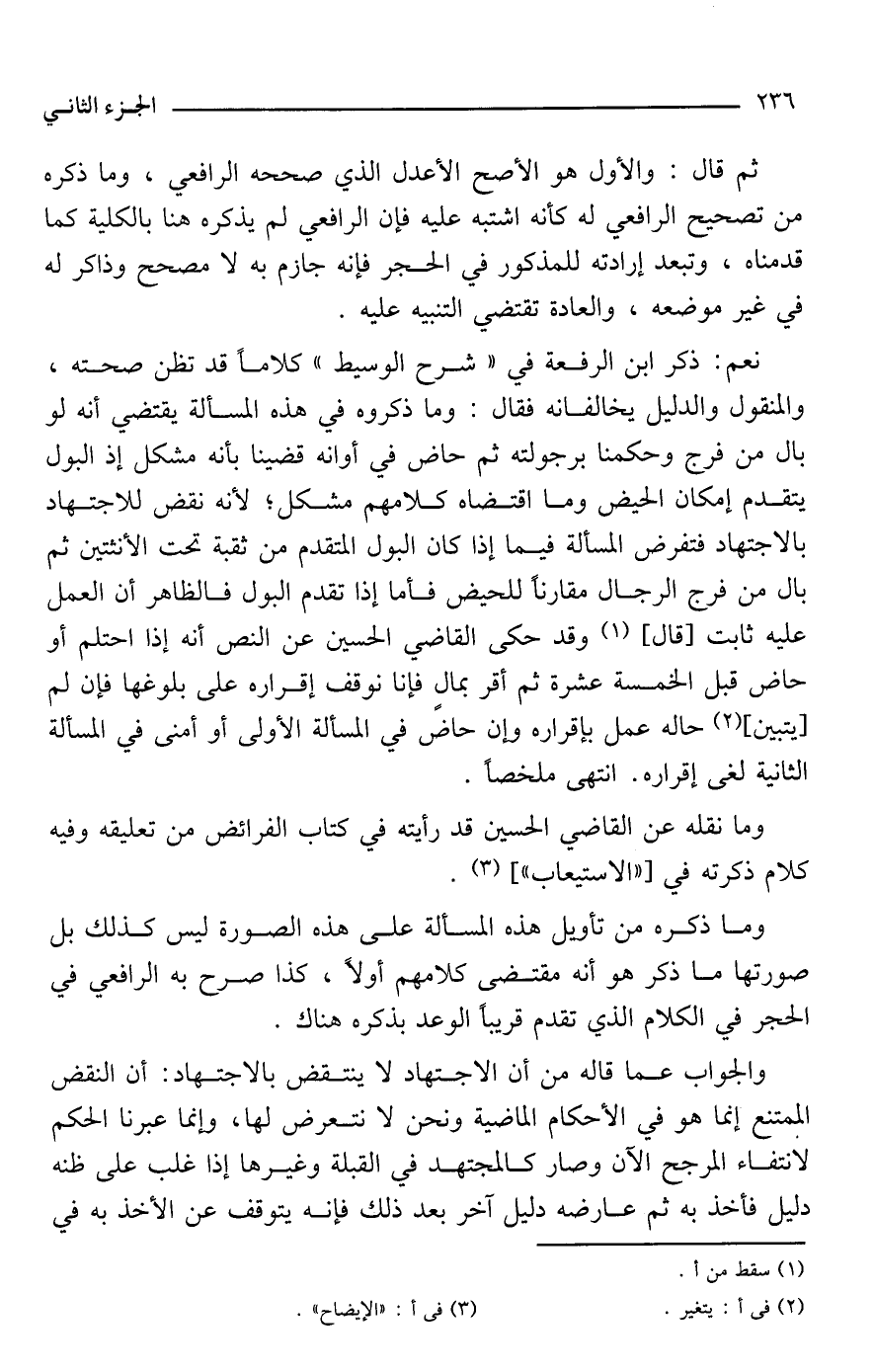 ثم قال: والأول هو الأصح الأعدل الذي صححه الرافعي، وما ذكره من تصحيح الرافعي له كأنه اشتبه عليه فإن الرافعي لم يذكره هنا بالكلية كما قدمناه، وتبعد إرادته للمذكور في الحجر فإنه جازم به لا مصحح وذاكر له في غير موضعه، والعادة تقتضي التنبيه عليه.