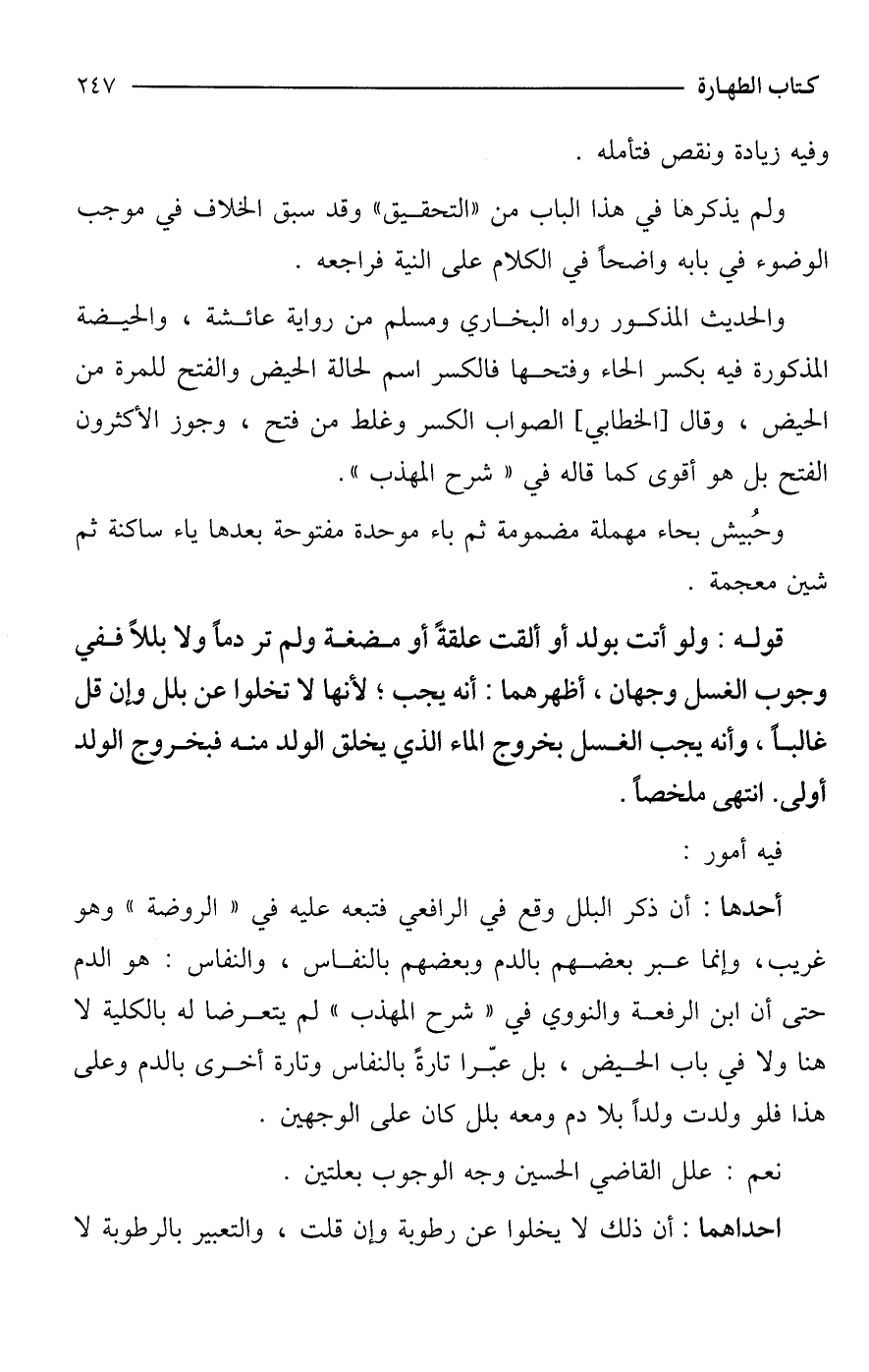 قوله: ولو أتت بولد أو ألقت علقةً أو مضغة ولم تر دمًا ولا بللًا ففي وجوب الغسل وجهان، أظهرهما: أنه يجب؛ لأنها لا تخلوا عن بلل وإن قل غالبًا، وأنه يجب الغسل بخروج الماء الذي يخلق الولد منه فبخروج الولد أولى. انتهى ملخصًا.