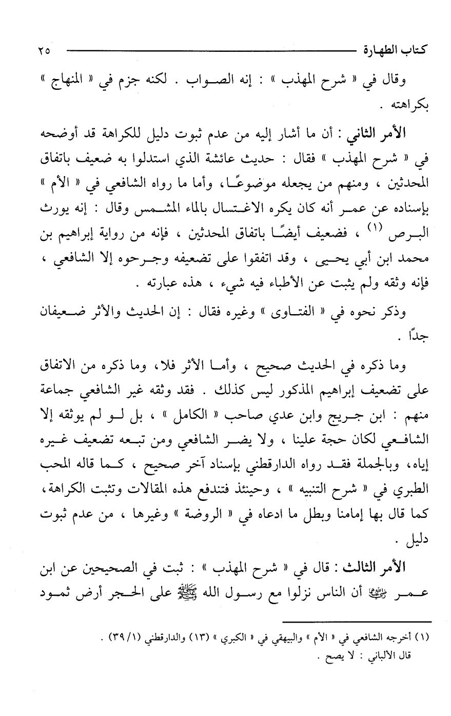 الأمر الثاني: أن ما أشار إليه من عدم ثبوت دليل للكراهة قد أوضحه في "شرح المهذب" فقال: حديث عائشة الذي استدلوا به ضعيف باتفاق المحدثين، ومنهم من يجعله موضوعًا، وأما ما رواه الشافعي في "الأم" بإسناده عن عمر أنه كان يكره الاغتسال بالماء المشمس وقال: إنه يورث البرص (¬1)، فضعيف أيضًا باتفاق المحدثين، فإنه من رواية إبراهيم بن محمد ابن أبي يحيى، وقد اتفقوا على تضعيفه وجرحوه إلا الشافعي، فإنه وثقه ولم يثبت عن الأطباء فيه شيء، هذه عبارته.