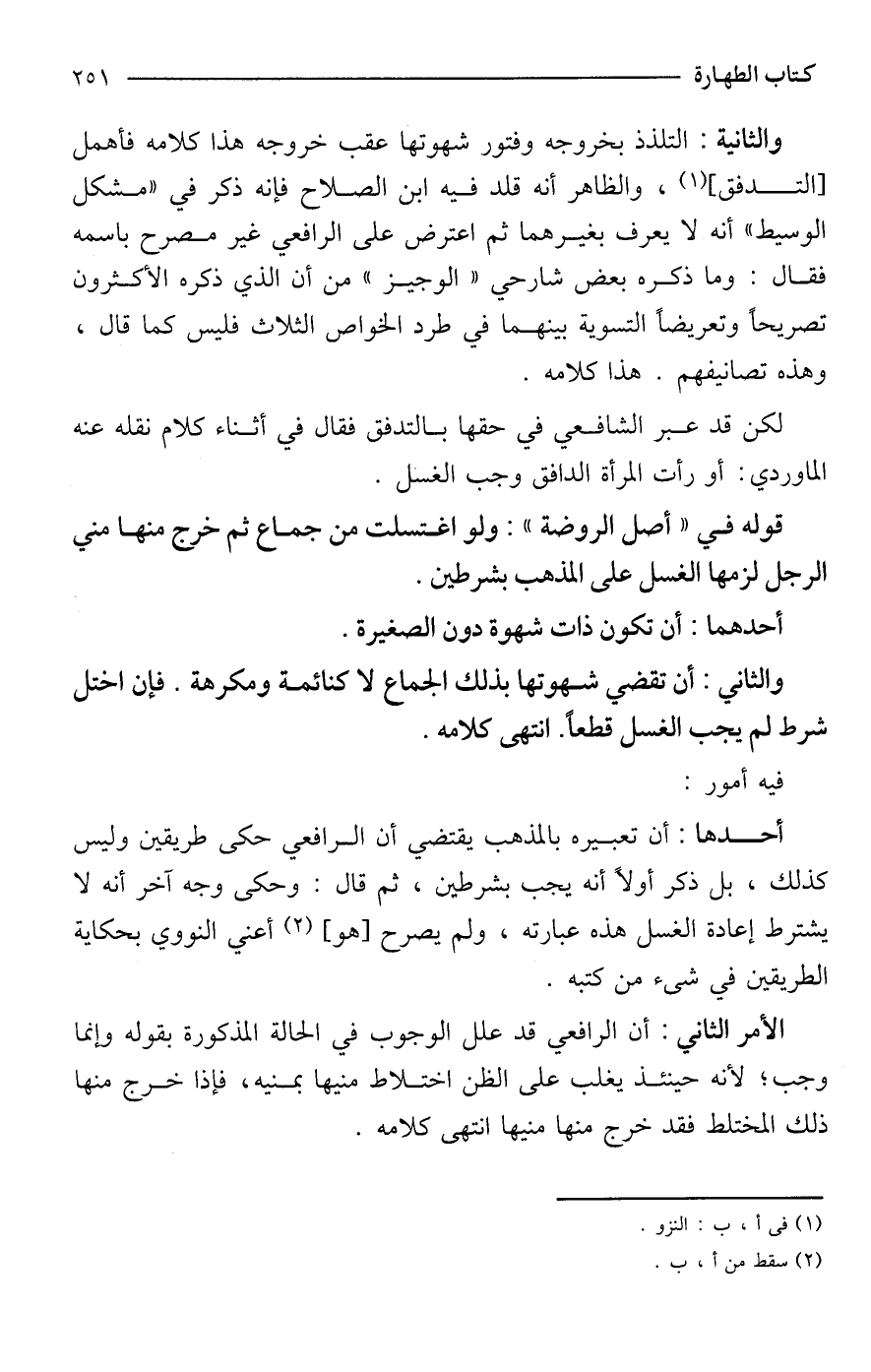 الأمر الثاني: أن الرافعي قد علل الوجوب في الحالة المذكورة بقوله وإنما وجب؛ لأنه حينئذ يغلب على الظن اختلاط منيها بمنيه، فإذا خرج منها ذلك المختلط فقد خرج منها منيها انتهى كلامه.