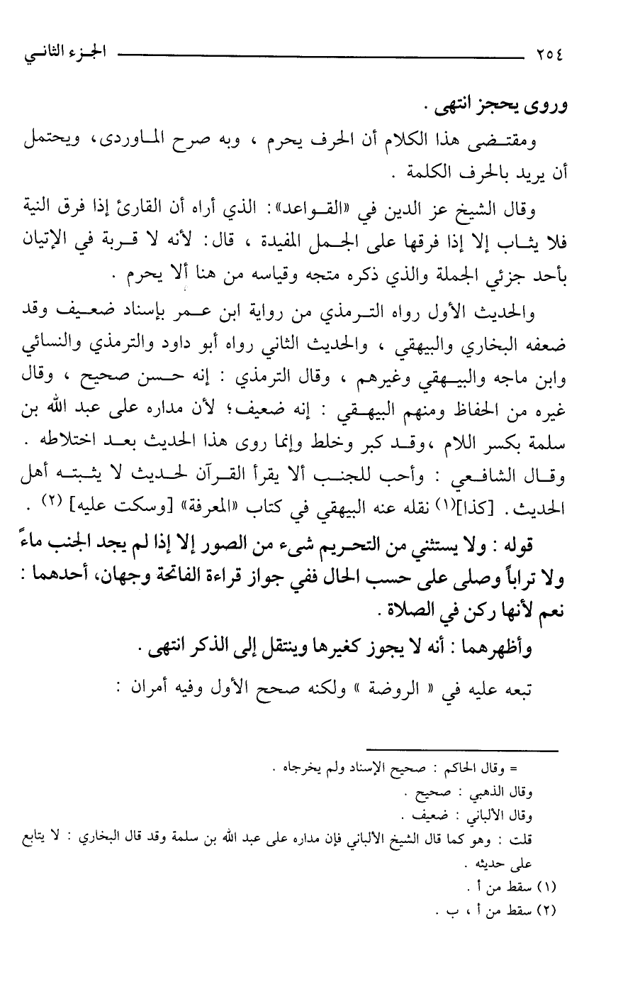 والحديث الأول رواه الترمذي من رواية ابن عمر بإسناد ضعيف وقد ضعفه البخاري والبيهقي، والحديث الثاني رواه أبو داود والترمذي والنسائي وابن ماجه والبيهقي وغيرهم، وقال الترمذي: إنه حسن صحيح، وقال غيره من الحفاظ ومنهم البيهقي: إنه ضعيف؛ لأن مداره على عبد الله بن سلمة بكسر اللام، وقد كبر وخلط وإنما روى هذا الحديث بعد اختلاطه. وقال الشافعي: وأحب للجنب ألا يقرأ القرآن لحديث لا يثبته أهل الحديث. [كذا] (¬1) نقله عنه البيهقي في كتاب "المعرفة" [وسكت عليه] (¬2).
