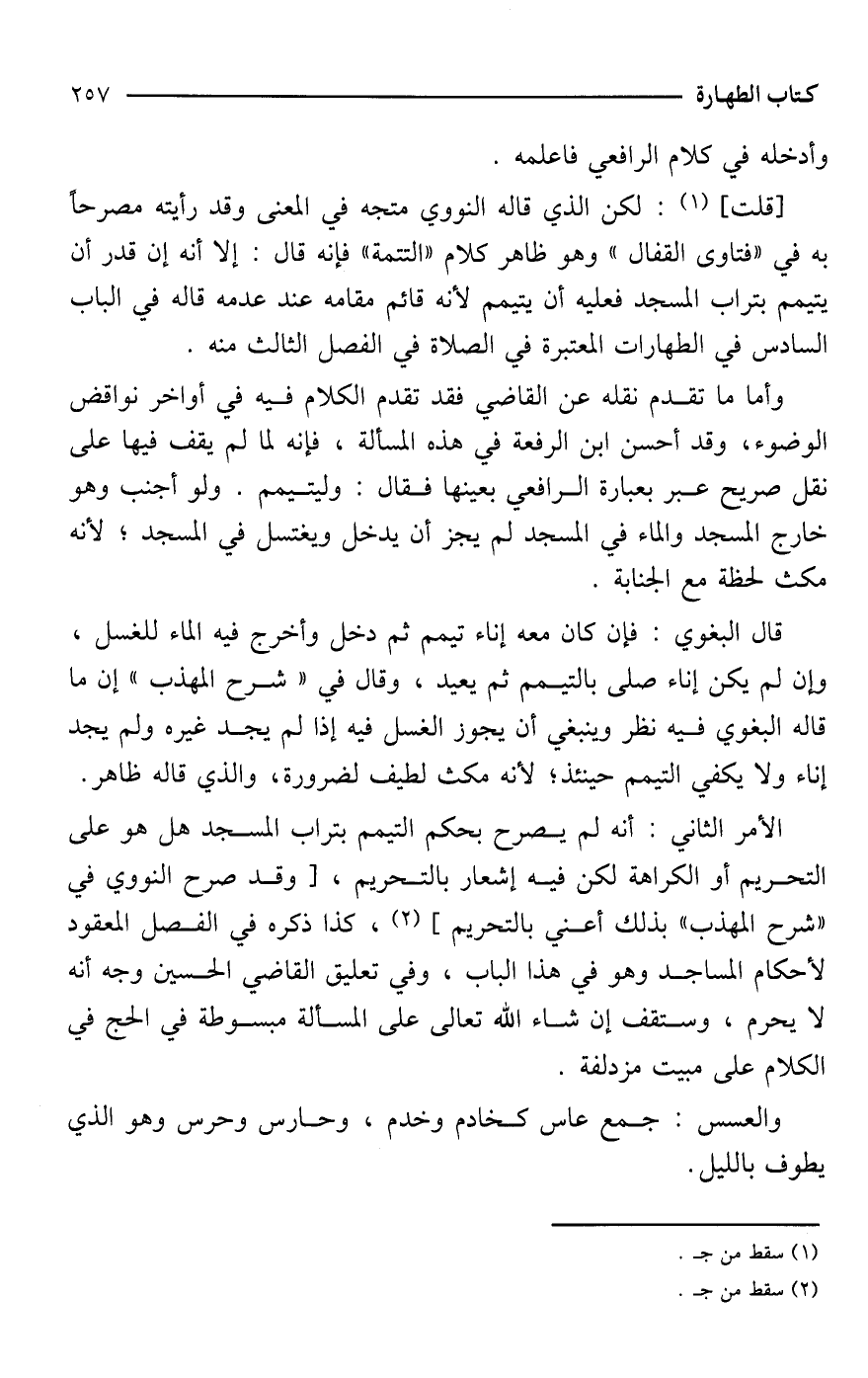 [قلت] (¬1): لكن الذي قاله النووي متجه في المعنى وقد رأيته مصرحًا به في "فتاوى القفال" وهو ظاهر كلام "التتمة" فإنه قال: إلا أنه إن قدر أن يتيمم بتراب المسجد فعليه أن يتيمم لأنه قائم مقامه عند عدمه قاله في الباب السادس في الطهارات المعتبرة في الصلاة في الفصل الثالث منه.