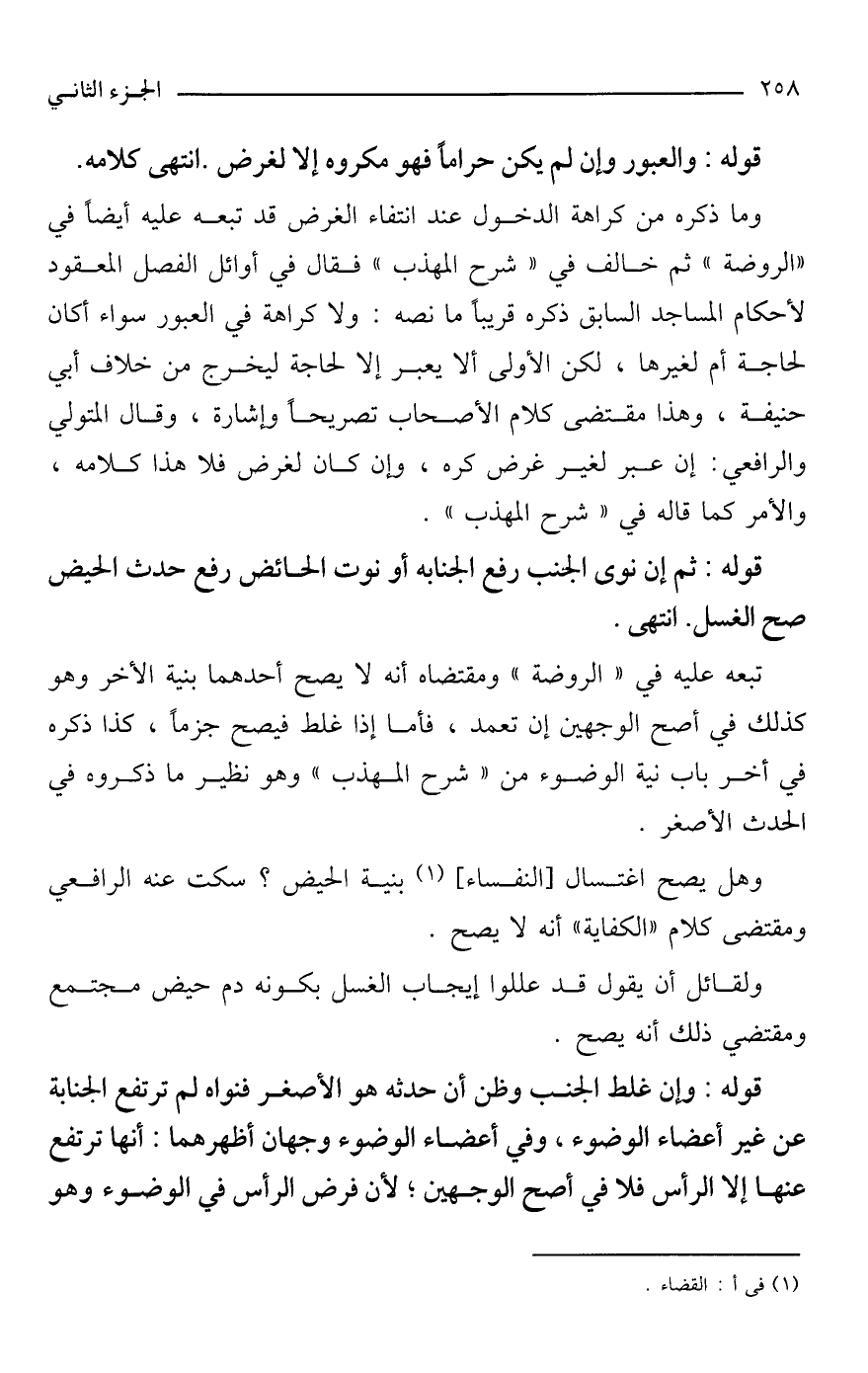 وما ذكره من كراهة الدخول عند انتفاء الغرض قد تبعه عليه أيضًا في "الروضة" ثم خالف في "شرح المهذب" فقال في أوائل الفصل المعقود لأحكام المساجد السابق ذكره قريبًا ما نصه: ولا كراهة في العبور سواء أكان لحاجة أم لغيرها، لكن الأولى ألا يعبر إلا لحاجة ليخرج من خلاف أبي حنيفة، وهذا مقتضى كلام الأصحاب تصريحًا وإشارة، وقال المتولي والرافعي: إن عبر لغير غرض كره، وإن كان لغرض فلا هذا كلامه، والأمر كما قاله في "شرح المهذب".