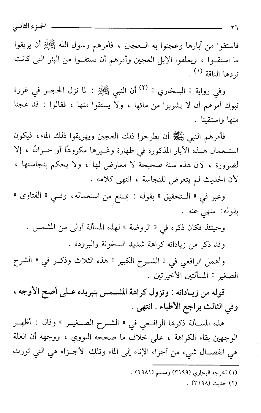 فأمرهم النبي - صَلَّى اللَّهُ عَلَيْهِ وَسَلَّمَ - أن يطرحوا ذلك العجين ويهريقوا ذلك الماء، فيكون استعمال هذه الآبار المذكورة في طهارة وغيرها مكروهًا أو حرامًا، إلا لضرورة، لأن هذه سنة صحيحة لا معارض لها، ولا يحكم بنجاستها، لأن الحديث لم يتعرض للنجاسة، انتهى كلامه.