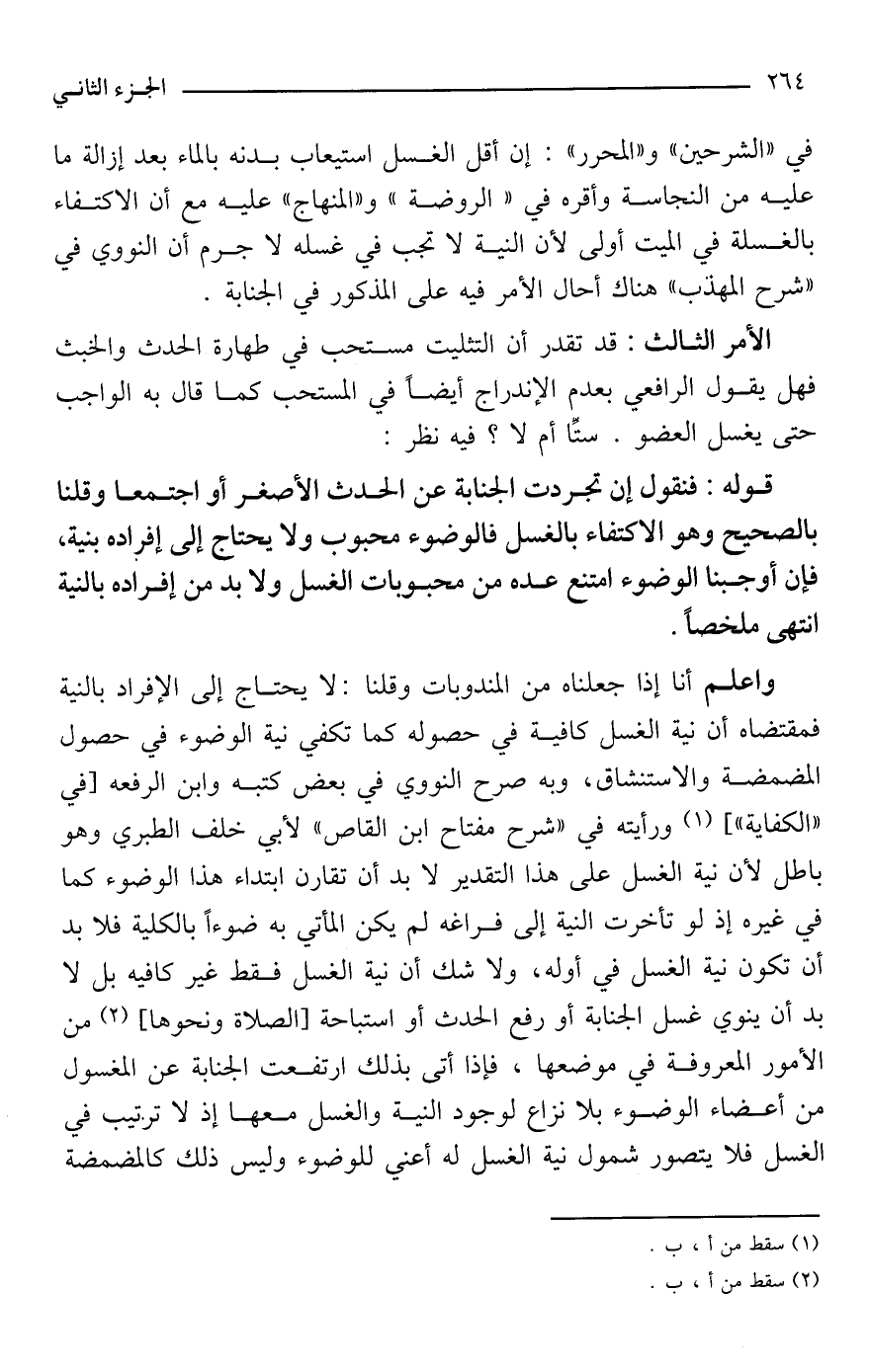 قوله: فنقول إن تجردت الجنابة عن الحدث الأصغر أو اجتمعا وقلنا بالصحيح وهو الاكتفاء بالغسل فالوضوء محبوب ولا يحتاج إلى إفراده بنية، فإن أوجبنا الوضوء امتنع عنده من محبوبات الغسل ولابد من إفراده بالنية انتهى ملخصًا.