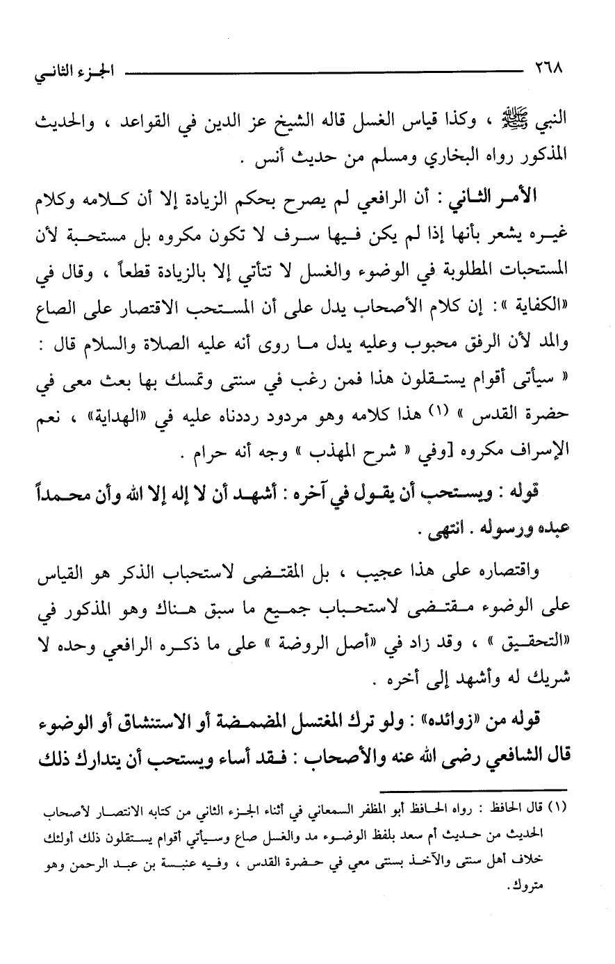 الأمر الثاني: أن الرافعي لم يصرح بحكم الزيادة إلا أن كلامه وكلام غيره يشعر بأنها إذا لم يكن فيها سرف لا تكون مكروه بل مستحبة لأن المستحبات المطلوبة في الوضوء والغسل لا تتأتي إلا بالزيادة قطعًا، وقال في "الكفاية": إن كلام الأصحاب يدل على أن المستحب الاقتصار على الصاع والمد لأن الرفق محبوب وعليه يدل ما روى أنه -عليه الصلاة والسلام- قال: "سيأتى أقوام يستقلون هذا فمن رغب في سنتى وتمسك بها بعث معى في حضرة القدس" (¬1) هذا كلامه وهو مردود رددناه عليه في "الهداية"، نعم الإسراف مكروه [وفي "شرح المهذب" وجه أنه حرام.