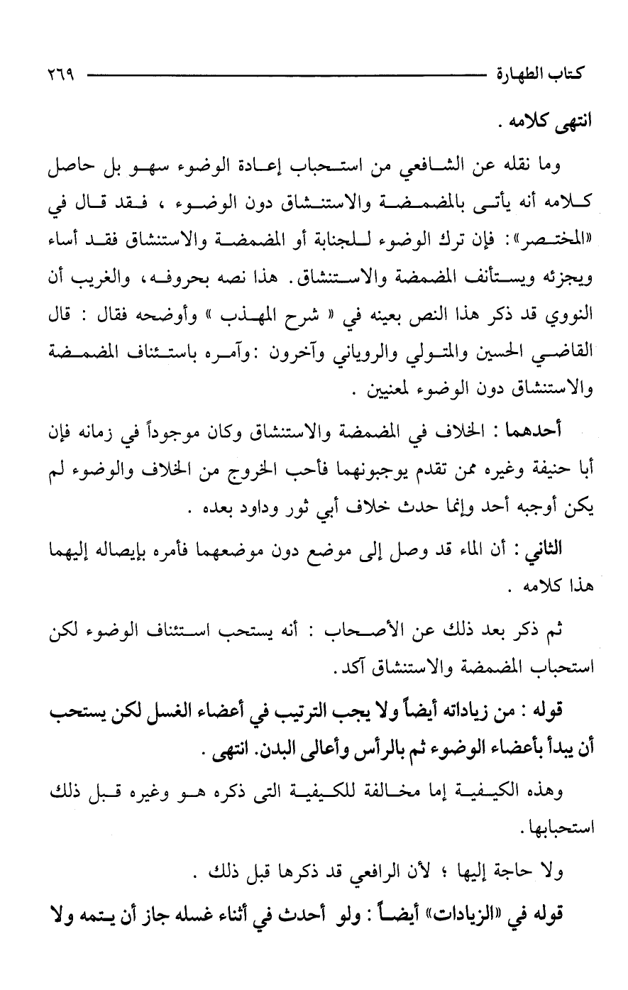 وما نقله عن الشافعي من استحباب إعادة الوضوء سهو بل حاصل كلامه أنه يأتى بالمضمضة والاستنشاق دون الوضوء، فقد قال في "المختصر": فإن ترك الوضوء للجنابة أو المضمضة والاستنشاق فقد أساء ويجزئه ويستأنف المضمضة والاستنشاق. هذا نصه بحروفه، والغريب أن النووي قد ذكر هذا النص بعينه في "شرح المهذب" وأوضحه فقال: قال القاضي الحسين والمتولي والروياني وآخرون: وآمره باستئناف المضمضة والاستنشاق دون الوضوء لمعنيين.