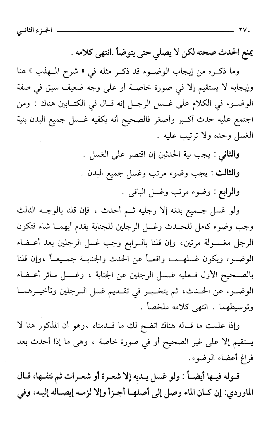 وإذا علمت ما قاله هناك اتضح لك ما قدمناه، وهو أن المذكور هنا لا يستقيم إلا على غير الصحيح أو في صورة خاصة، وهى ما إذا أحدث بعد فراغ أعضاء الوضوء.