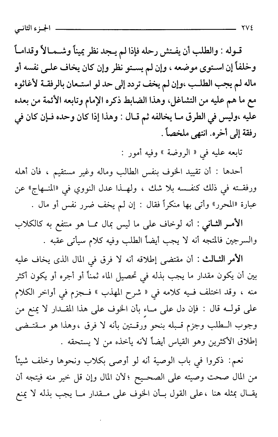 الأمر الثالث: أن مقتضى إطلاقه أنه لا فرق في المال الذى يخاف عليه بين أن يكون مقدار ما يجب بذله في تحصيل الماء ثمنًا أو أجره أو يكون أكثر منه، وقد اختلف فيه كلامه في "شرح المهذب" فجزم في أواخر الكلام على قوله قال: فإن دل على ماءٍ بأن الخوف على هذا المقدار لا يمنع من وجوب الطلب وجزم قبله بنحو ورقتين بأنه لا فرق، وهذا هو مقتضى إطلاق الأكثرين وهو القياس أيضًا لأنه يأخذه من لا يستحقه.