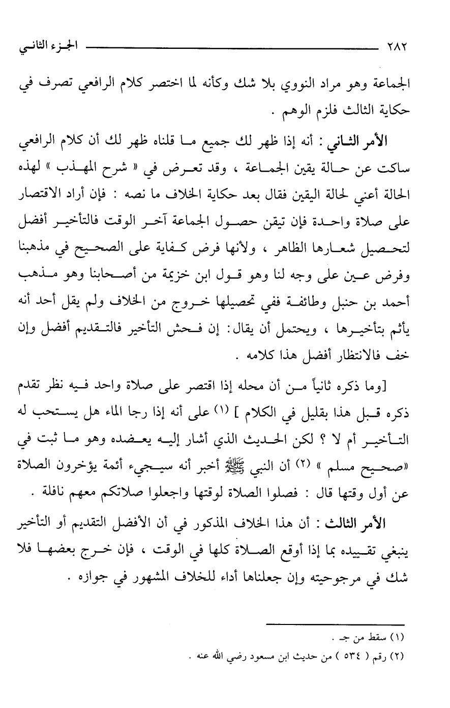 الأمر الثاني: أنه إذا ظهر لك جميع ما قلناه ظهر لك أن كلام الرافعي ساكت عن حالة يقين الجماعة، وقد تعرض في "شرح المهذب" لهذه الحالة أعني لحالة اليقين فقال بعد حكاية الخلاف ما نصه: فإن أراد الاقتصار على صلاة واحدة فإن تيقن حصول الجماعة آخر الوقت فالتأخير أفضل لتحصيل شعارها الظاهر، ولأنها فرض كفاية على الصحيح في مذهبنا وفرض عين على وجه لنا وهو قول ابن خزيمة من أصحابنا وهو مذهب أحمد بن حنبل وطائفة ففي تحصيلها خروج من الخلاف ولم يقل أحد أنه يأثم بتأخيرها، ويحتمل أن يقال: إن فحش التأخير فالتقديم أفضل وإن خف فالانتظار أفضل هذا كلامه.