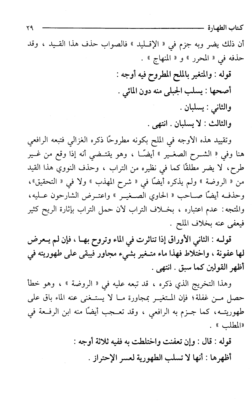 وتقييد هذه الأوجه في الملح بكونه مطروحًا ذكره الغزالي فتبعه الرافعي هنا وفي "الشرح الصغير" أيضًا، وهو يقتضي أنه إذا وقع من غير طرح، لا يضر مطلقًا كما في نظيره من التراب، وحذف النووي هذا القيد من "الروضة" ولم يذكره أيضًا في "شرح المهذب" ولا في "التحقيق"، وحذفه أيضًا صاحب "الحاوي الصغير" واعترض الشارحون عليه، والمتجه: عدم اعتباره، بخلاف التراب لأن حمل التراب بإثارة الريح كثير فيعفى عنه بخلاف الملح.