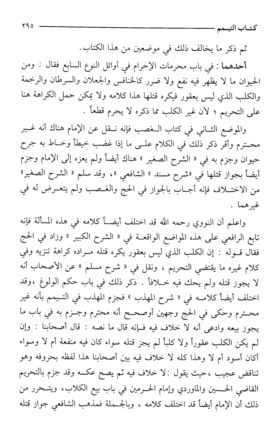 واعلم أن النووي -رحمه الله- قد اختلف أيضًا كلامه في هذه المسألة فإنه تابع الرافعي على هذه المواضع الواقعة في "الشرح الكبير" وزاد في الحج فقال قوله: إن الكلب الذي ليس بعقور يكره قتله مراده كراهة تنزيه وفي كلام غيره ما يقتضي التحريم، ونقل في "شرح مسلم" عن الأصحاب أنه لا يجوز قتله ولم يحك فيه خلافًا. ذكر ذلك في باب حكم الولوغ، وقد اختلف أيضًا كلامه في "شرح المهذب" فجزم المهذب في التيمم بأنه غير محترم وحكى في الحج وجهين أو صحح أنه محترم وجزم به في باب ما يجوز بيعه وادعى أنه لا خلاف فيه فإنه قال ما نصه: قال أصحابنا: وإن لم يكن الكلب عقورًا ولا كلبًا لم يجز قتله سواء كان فيه منفعة أم لا وسواء أكان أسود أم لا وهذا كله لا خلاف فيه بين أصحابنا هذا لفظه بحروفه وهو تناقض عجيب، حيث يقول: لا خلاف فيه ثم يصح عكسه وقد جزم بالتحريم القاضي الحسين والماوردي وإمام الحرمين في باب بيع الكلاب، ويتحرر من ذلك أن الإمام أيضًا قد اختلف كلامه، وبالجملة فمذهب الشافعي جواز قتله