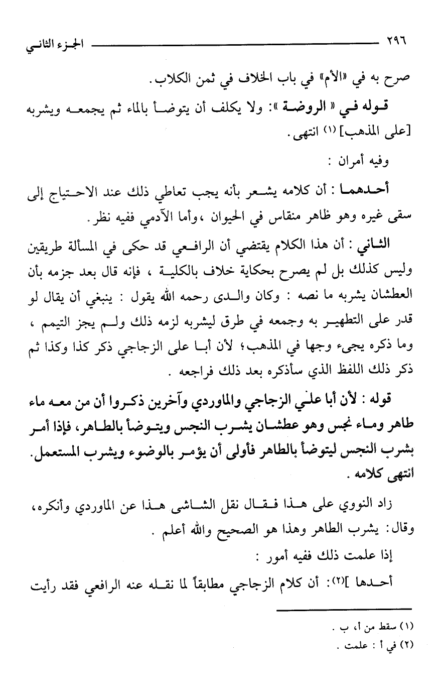 قوله: لأن أبا علي الزجاجي والماوردي وآخرين ذكروا أن من معه ماء طاهر وماء نجس وهو عطشان يشرب النجس ويتوضأ بالطاهر، فإذا أمر بشرب النجس ليتوضأ بالطاهر فأولى أن يؤمر بالوضوء ويشرب المستعمل. انتهى كلامه.
