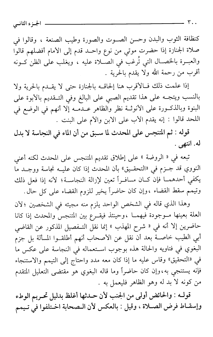 تبعه في "الروضة" على إطلاق تقديم المتنجس على المحدث لكنه أعني النووي قد جزم في "التحقيق" بأن المحدث إذا كان عليه نجاسة ووجد ما يكفي أحدهما فإن كان مسافرًا تعين لإزالة النجاسة؛ لأنه إذا فعل ذلك وتيمم سقط القضاء، وإن كان حاضرًا يخير للزوم القضاء على كل حال.