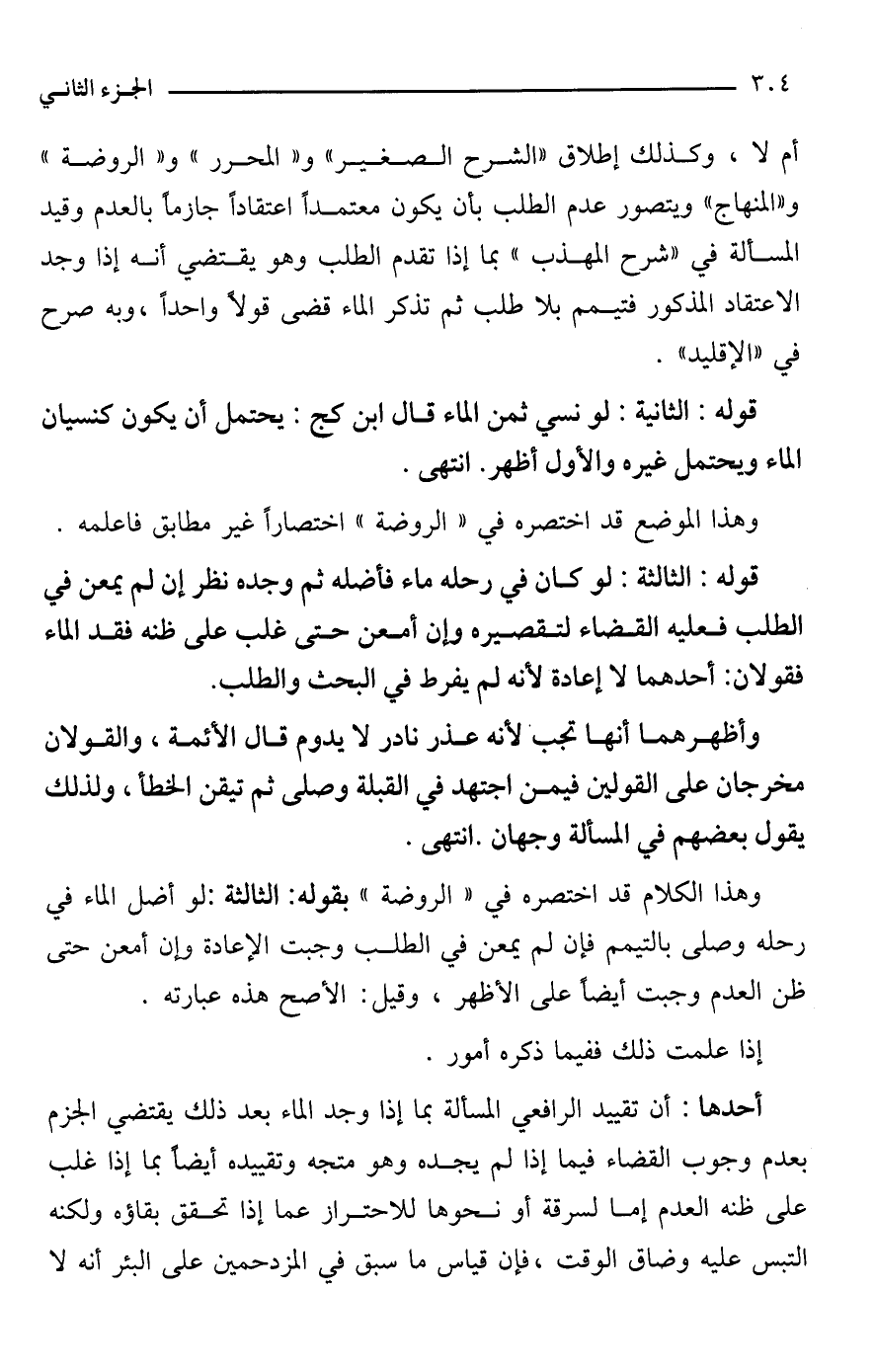 وهذا الكلام قد اختصره في "الروضة" بقوله: الثالثة: لو أضل الماء في رحله وصلى بالتيمم فإن لم يمعن في الطلب وجبت الإعادة وإن أمعن حتى ظن العدم وجبت أيضًا على الأظهر، وقيل: الأصح هذه عبارته.