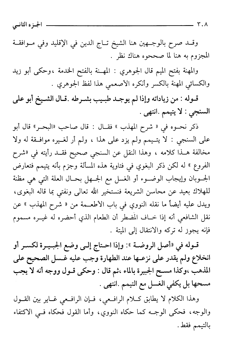 ذكر نحوه في "شرح المهذب" فقال: قال صاحب "البحر" قال أبو على السنجي: لا يتيمم ولم يزد على هذا، ولم أر لغيره موافقة له ولا مخالفة هذا كلامه، وهذا النقل عن السنجي صحيح فقد رأيته في "شرح الفروع " له لكن ذكر البغوي في فتاوية هذه المسألة وجزم بأنه يتيمم فتعارض الجوبان وإيجاب الوضوء أو الغسل مع الجهل بحال العلة التي هي مظنة للهلاك بعيد عن محاسن الشريعة فنستخير الله تعالى ونفتي بما قاله البغوى، ويدل عليه أيضًا ما نقله النووي في باب الأطعمة من "شرح المهذب" عن نقل الشافعي أنه إذا خاف المضطر أن الطعام الذي أحضره له غيره مسموم فإنه يجوز له تركه والانتقال إلى الميتة.