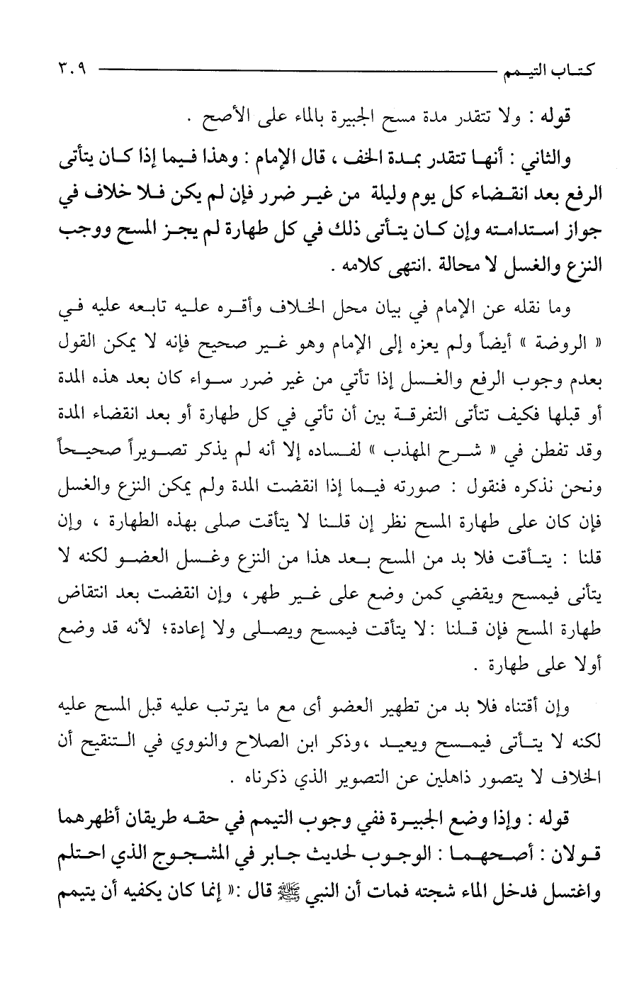 وما نقله عن الإمام في بيان محل الخلاف وأقره عليه تابعه عليه في "الروضة" أيضًا ولم يعزه إلى الإمام وهو غير صحيح فإنه لا يمكن القول بعدم وجوب الرفع والغسل إذا تأتي من غير ضرر سواء كان بعد هذه المدة أو قبلها فكيف تتأتى التفرقة بين أن تأتي في كل طهارة أو بعد انقضاء المدة وقد تفطن في "شرح المهذب" لفساده إلا أنه لم يذكر تصويرًا صحيحًا ونحن نذكره فنقول: صورته فيما إذا انقضت المدة ولم يمكن النزع والغسل فإن كان على طهارة المسح نظر إن قلنا لا يتأقت صلى بهذه الطهارة، وإن قلنا: يتأقت فلابد من المسح بعد هذا من النزع وغسل العضو لكنه لا يتأنى فيمسح ويقضي كمن وضع على غير طهر، وإن انقضت بعد انتقاض طهارة المسح فإن قلنا: لا يتأقت فيمسح ويصلى ولا إعادة؛ لأنه قد وضع أولا على طهارة.