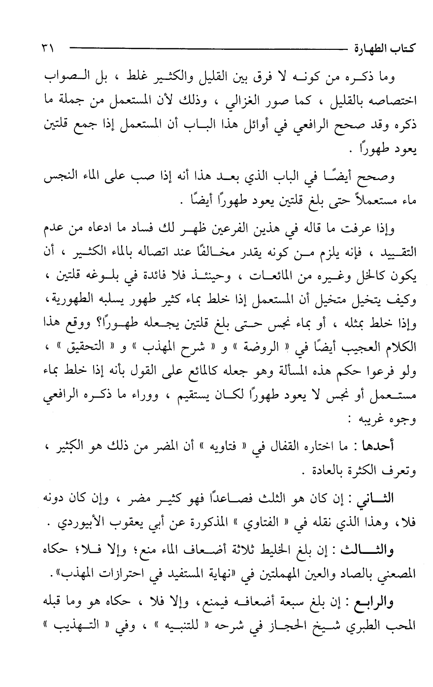 وإذا عرفت ما قاله في هذين الفرعين ظهر لك فساد ما ادعاه من عدم التقييد، فإنه يلزم من كونه يقدر مخالفًا عند اتصاله بالماء الكثير، أن يكون كالخل وغيره من المائعات، وحينئذ فلا فائدة في بلوغه قلتين، وكيف يتخيل متخيل أن المستعمل إذا خلط بماء كثير طهور يسلبه الطهورية، وإذا خلط بمثله، أو بماء نجس حتى بلغ قلتين يجعله طهورًا؟ ووقع هذا الكلام العجيب أيضًا في "الروضة" و"شرح المهذب" و"التحقيق"، ولو فرعوا حكم هذه المسألة وهو جعله كالمائع على القول بأنه إذا خلط بماء مستعمل أو نجس لا يعود طهورًا لكان يستقيم، ووراء ما ذكره الرافعي وجوه غريبه: