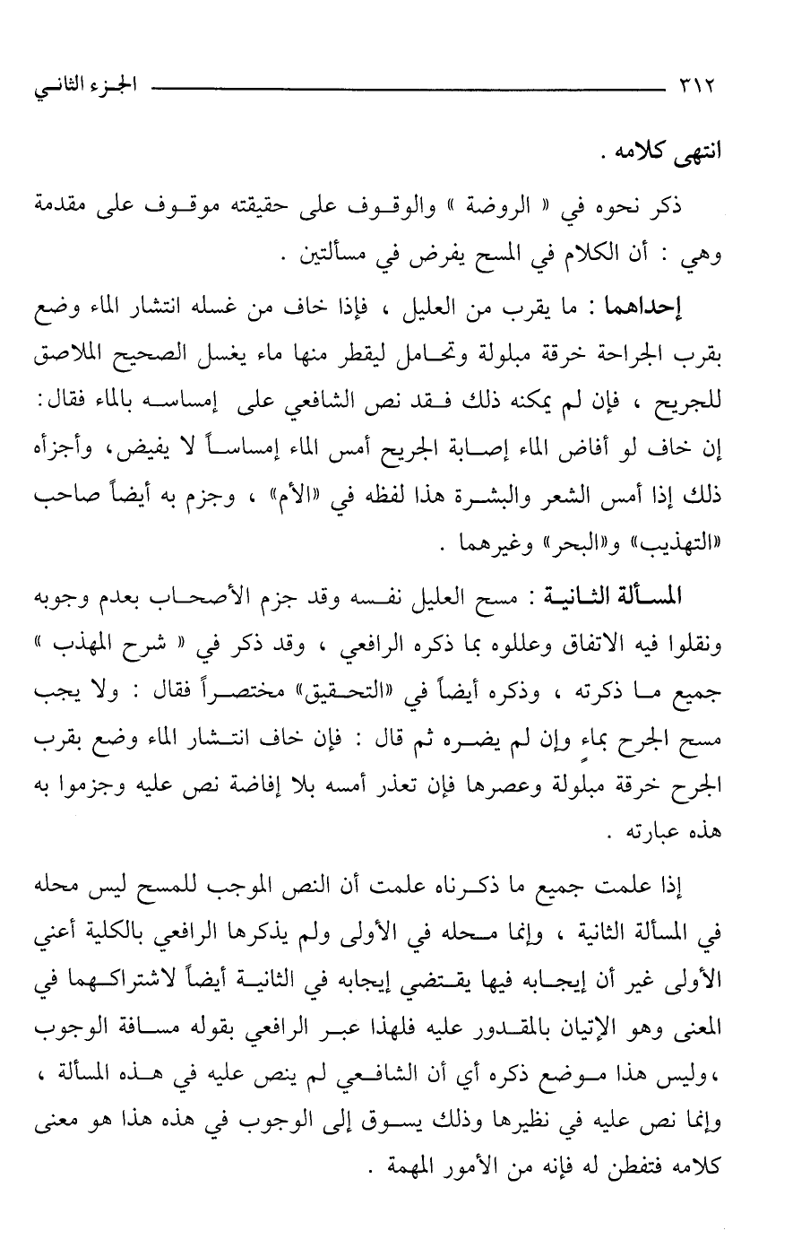 المسألة الثانية: مسح العليل نفسه وقد جزم الأصحاب بعدم وجوبه ونقلوا فيه الاتفاق وعللوه بما ذكره الرافعي، وقد ذكر في "شرح المهذب" جميع ما ذكرته، وذكره أيضًا في "التحقيق" مختصرًا فقال: ولا يجب مسح الجرح بماءٍ وإن لم يضره ثم قال: فإن خاف انتشار الماء وضع بقرب الجرح خرقة مبلولة وعصرها فإن تعذر أمسه بلا إفاضة نص عليه وجزموا به هذه عبارته.