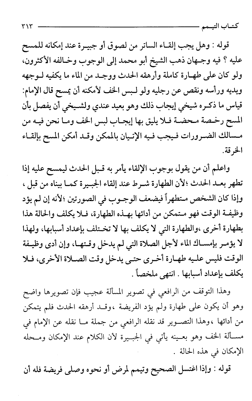 وهذا التوقف من الرافعي في تصوير المسألة عجيب فإن تصويرها واضح وهو أن يكون على طهارة ولم يؤد الفريضة، وقد أرهقه الحدث فلم يتمكن من أدائها، وهذا التصوير قد نقله الرافعي من جملة ما نقله عن الإمام في مسألة الخف وهو بعينه يأتي في الجبيرة لأن الكلام عند الإمكان ومحله الإمكان في هذه الحالة.