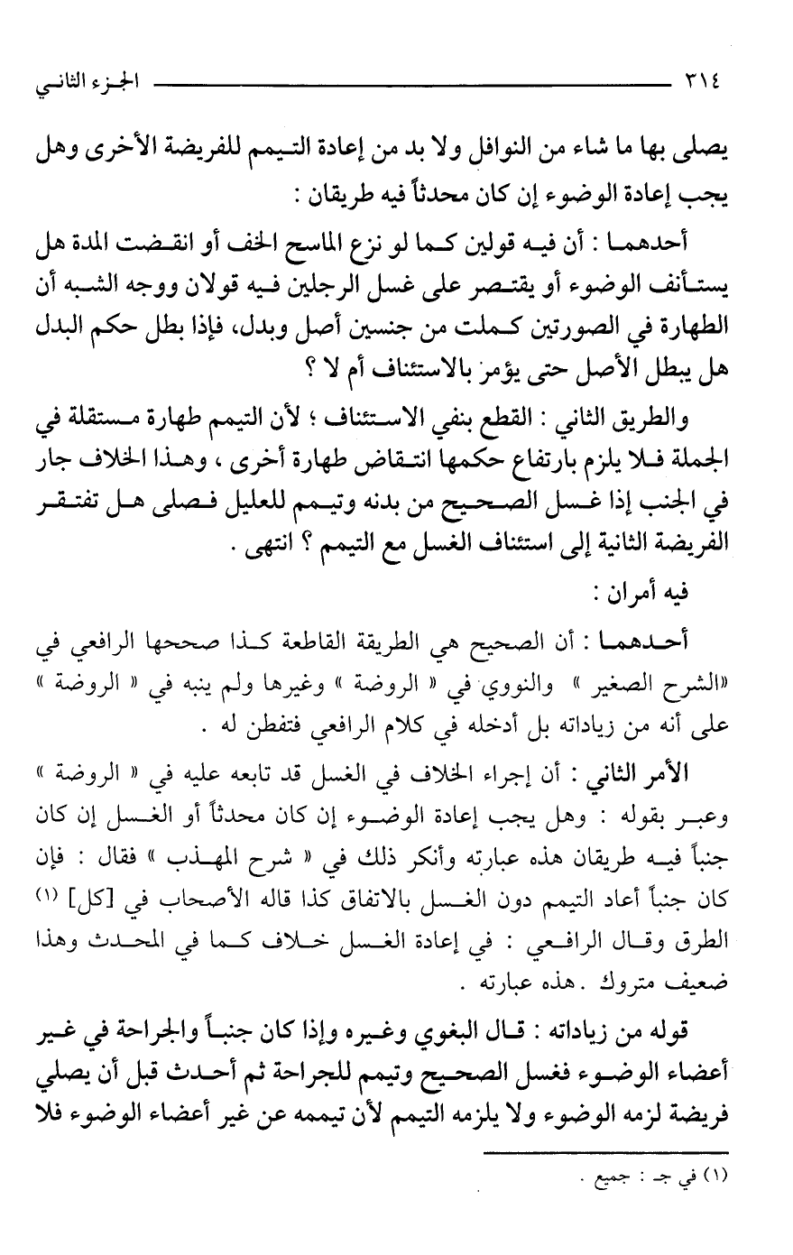 والطريق الثاني: القطع بنفي الاستئناف؛ لأن التيمم طهارة مستقلة في الجملة فلا يلزم بارتفاع حكمها انتقاض طهارة أخرى، وهذا الخلاف جار في الجنب إذا غسل الصحيح من بدنه وتيمم للعليل فصلى هل تفتقر الفريضة الثانية إلى استئناف الغسل مع التيمم؟ انتهى.
