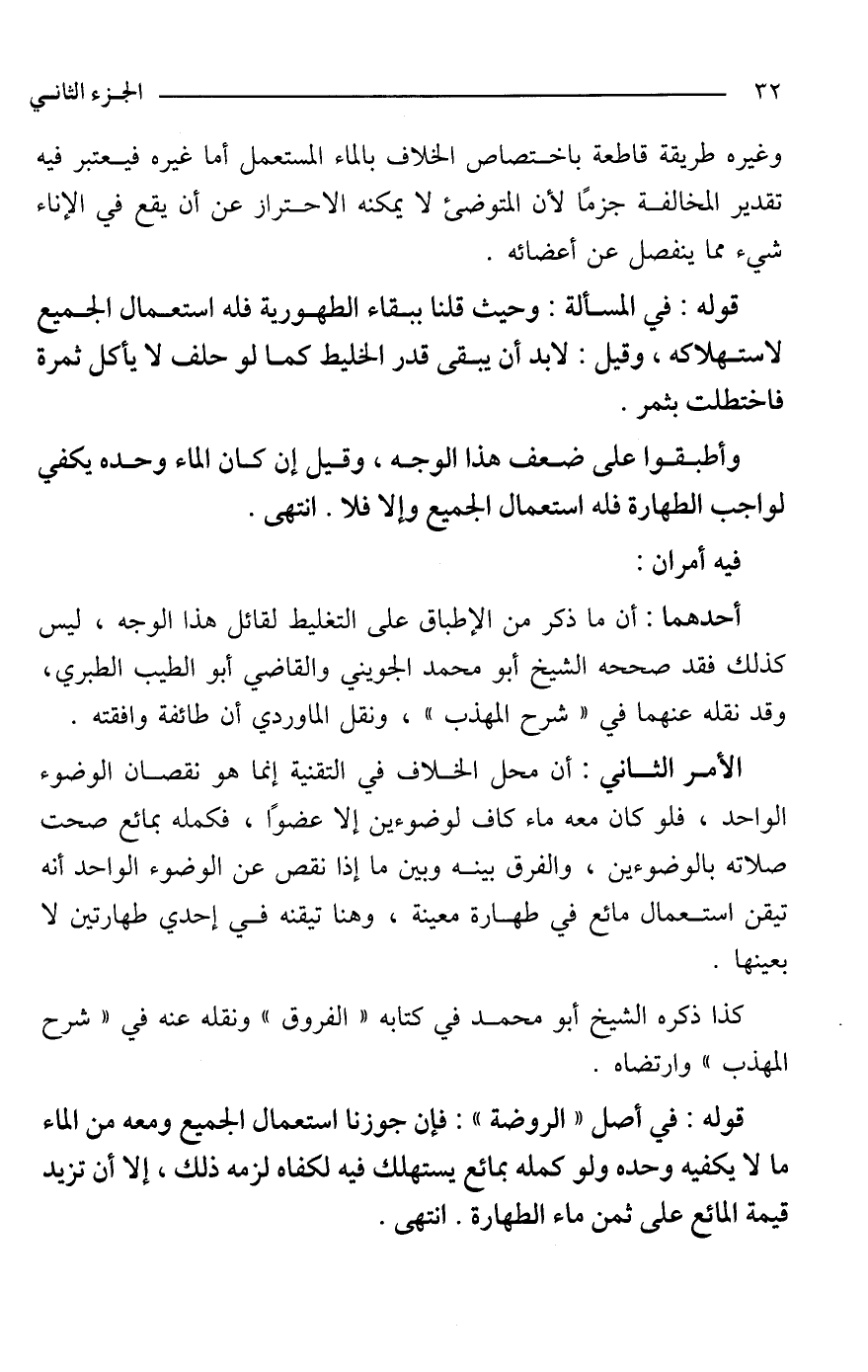 الأمر الثاني: أن محل الخلاف في التقنية إنما هو نقصان الوضوء الواحد، فلو كان معه ماء كاف لوضوءين إلا عضوًا، فكمله بمائع صحت صلاته بالوضوءين، والفرق بينه وبين ما إذا نقص عن الوضوء الواحد أنه تيقن استعمال مائع في طهارة معينة، وهنا تيقنه في إحدي طهارتين لا بعينها.