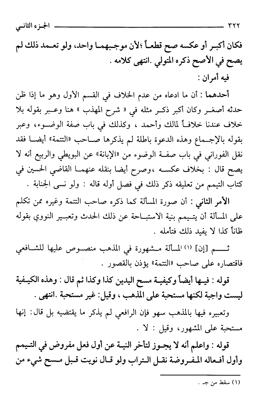 الأمر الثاني: أن صورة المسألة كما ذكره صاحب التتمة وغيره ممن تكلم على المسألة أن يتيمم بنية الاستباحة عن ذلك الحدث وتعبير النووي بقوله ظانًا كذا لا يفيد ذلك فتأمله.