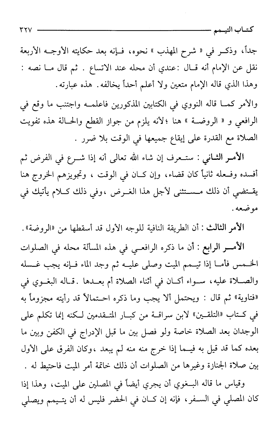 الأمر الرابع: أن ما ذكره الرافعي في هذه المسألة محله في الصلوات الخمس فأما إذا تيمم الميت وصلى عليه ثم وجد الماء فإنه يجب غسله والصلاة عليه، سواء أكان في أثناء الصلاة أم بعدها. قاله البغوي في "فتاويه" ثم قال: ويحتمل ألا يجب وما ذكره احتمالًا قد رأيته مجزومًا به في كتاب "التلقين" لابن سراقة من كبار المتقدمين لكنه إنما تكلم على الوجدان بعد الصلاة خاصة ولو فصل بين ما قبل الإدراج في الكفن وبين ما بعده كما قد قيل به فيما إذا خرج منه منه لم يبعد، وكان الفرق على الأول بين صلاة الجنازة وغيرها من الصلوات أن ذلك خاتمة أمر الميت فاحتيط له.