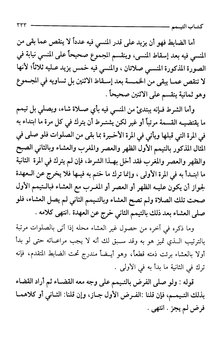 وأما الشرط فإنه يبتدئ من المنسي فيه بأي صلاة شاء، ويصلي بل تيمم ما يقتضيه القسمة مرتبًا أو غير لكن يشترط أن يترك في كل مرة ما ابتداء به في المرة التي قبلها ويأتي في المرة الأخيرة بما بقى من الصلوات فلو صلى في المثال المذكور بالتيمم الأول الظهر والعصر والمغرب والعشاء وبالثاني الصبح والظهر والعصر والمغرب فقد أخل بهذا الشرط، فإن لم يترك في المرة الثانية ما ابتدأ به في المرة الأولى، وإنما ترك ما ختم به فيها فلا يخرج عن العهدة لجواز أن يكون عليه الظهر أو العصر أو المغرب مع العشاء فبالتيمم الأول صحت تلك الصلاة ولم تصح العشاء وبالتيمم الثاني لم يصل العشاء، فلو صلى العشاء بعد ذلك بالتيمم الثاني خرج عن العهدة. انتهى كلامه.
