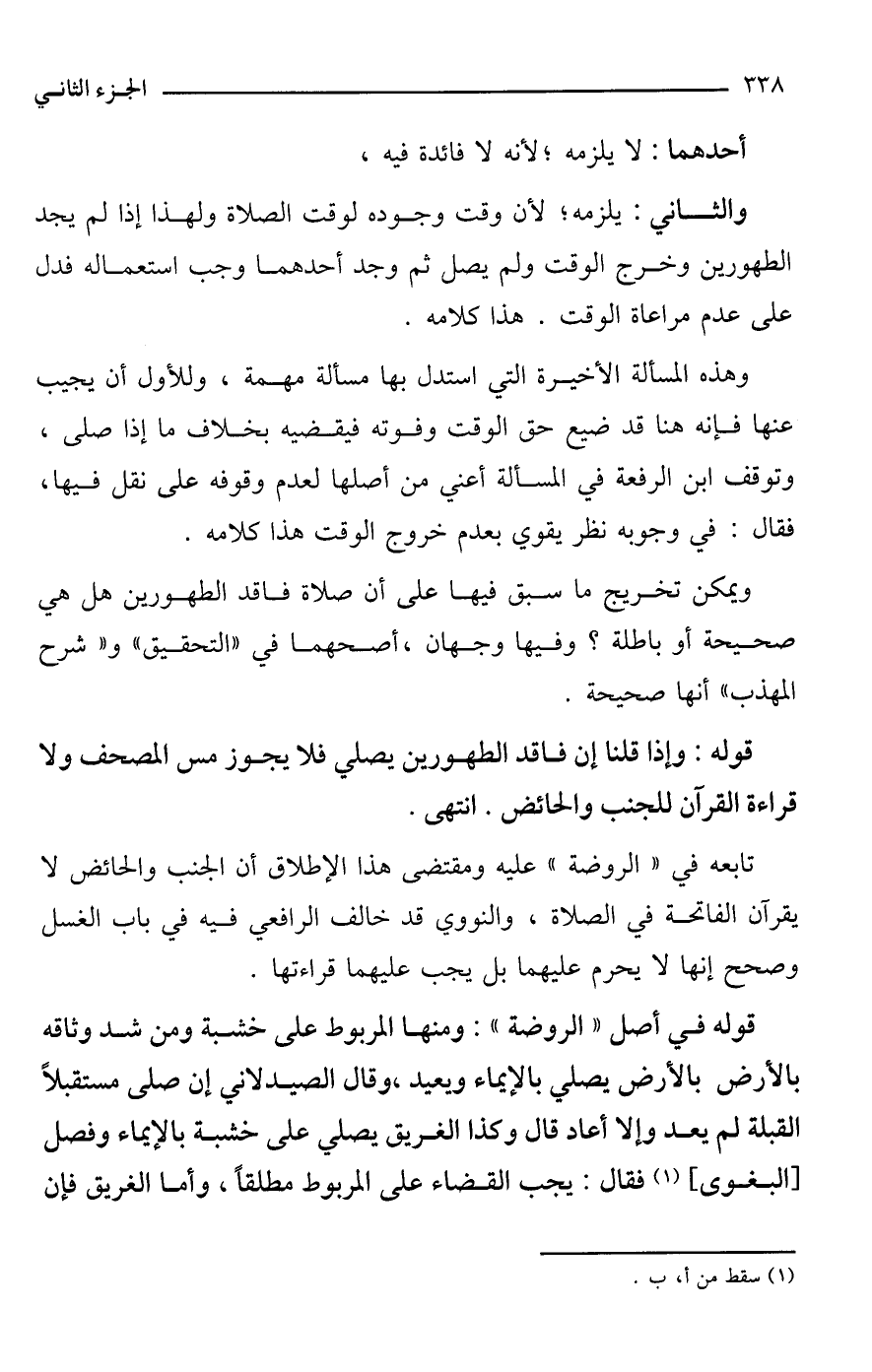 والثاني: يلزمه؛ لأن وقت وجوده لوقت الصلاة ولهذا إذا لم يجد الطهورين وخرج الوقت ولم يصل ثم وجد أحدهما وجب استعماله فدل على عدم مراعاة الوقت. هذا كلامه.