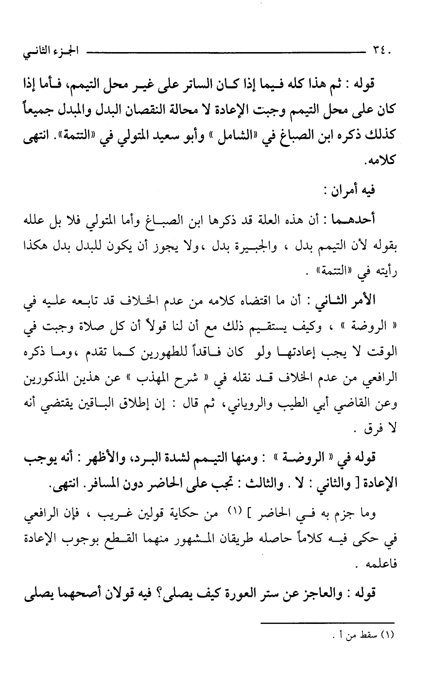 الأمر الثاني: أن ما اقتضاه كلامه من عدم الخلاف قد تابعه عليه في "الروضة"، وكيف يستقيم ذلك مع أن لنا قولًا أن كل صلاة وجبت في الوقت لا يجب إعادتها ولو كان فاقدًا للطهورين كما تقدم، وما ذكره الرافعي من عدم الخلاف قد نقله في "شرح المهذب" عن هذين المذكورين وعن القاضي أبي الطيب والروياني، ثم قال: إن إطلاق الباقين يقتضي أنه لا فرق.