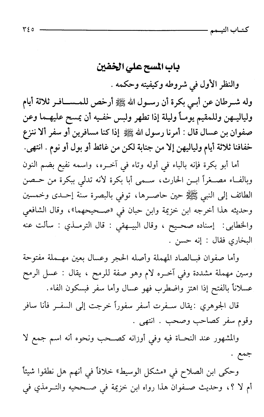 وله شرطان عن أبي بكرة أن رسول الله - صَلَّى اللَّهُ عَلَيْهِ وَسَلَّمَ - أرخص للمسافر ثلاثة أيام ولياليهن وللمقيم يومًا وليلة إذا تطهر ولبس خفيه أن يمسح عليهما وعن صفوان بن عسال قال: أمرنا رسول الله - صَلَّى اللَّهُ عَلَيْهِ وَسَلَّمَ - إذا كنا مسافرين أو سفر ألا ننزع خفافنا ثلاثة أيام ولياليهن إلا من جنابة لكن من غائط أو بول أو نوم. انتهى.