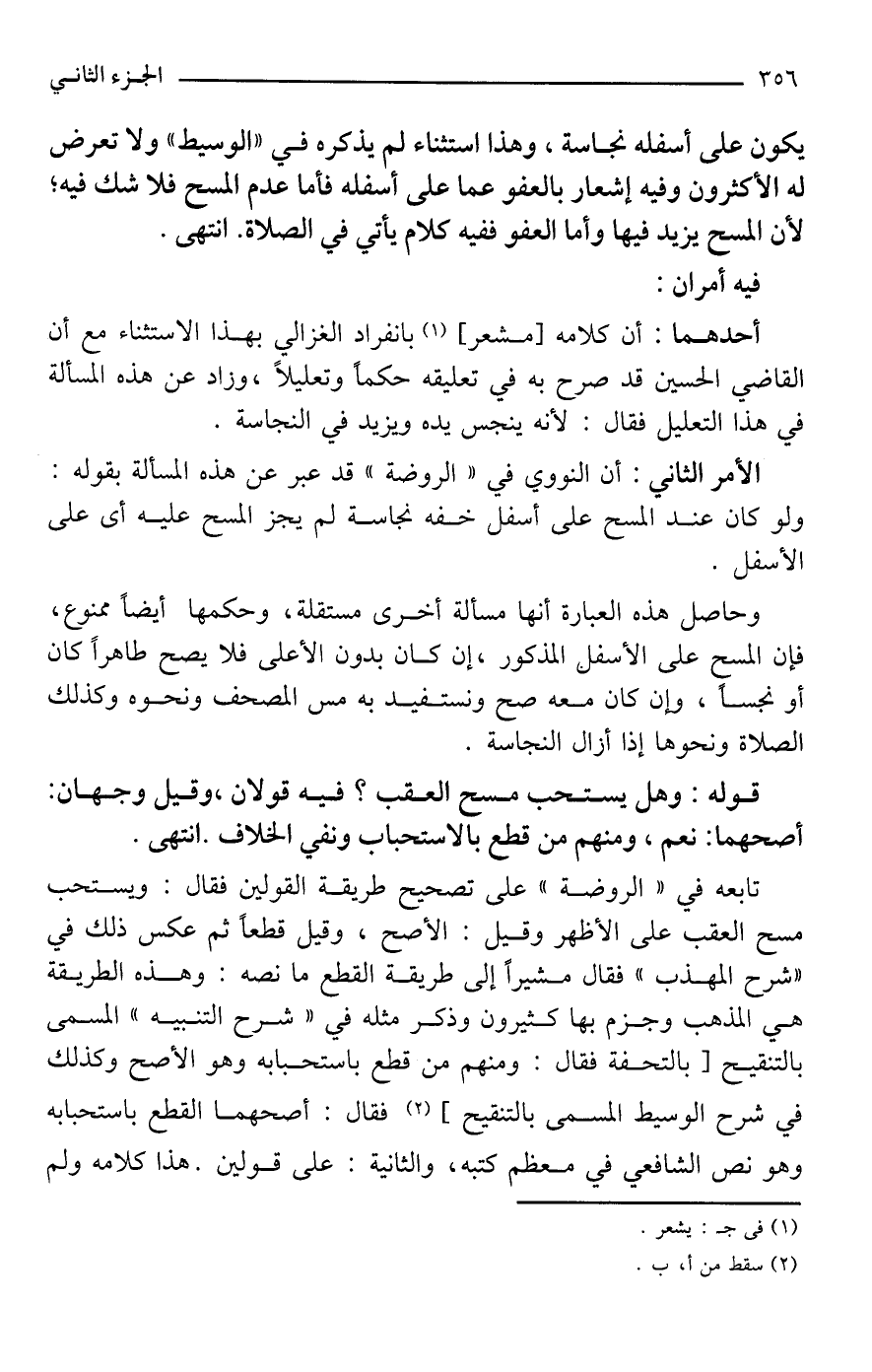 الأمر الثاني: أن النووي في "الروضة" قد عبر عن هذه المسألة بقوله: ولو كان عند المسح على أسفل خفه نجاسة لم يجز المسح عليه أى على الأسفل.