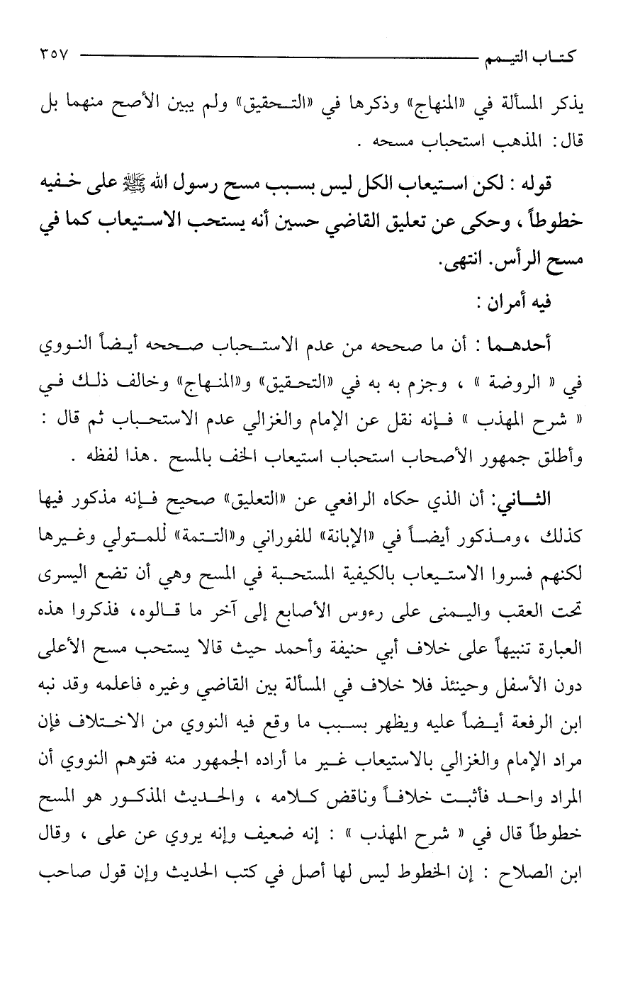الثاني: أن الذي حكاه الرافعي عن "التعليق" صحيح فإنه مذكور فيها كذلك، ومذكور أيضًا في "الإبانة" للفوراني و"التتمة" للمتولي وغيرها لكنهم فسروا الاستيعاب بالكيفية المستحبة في المسح وهي أن تضع اليسرى تحت العقب واليمنى على رءوس الأصابع إلى آخر ما قالوه، فذكروا هذه العبارة تنبيهًا على خلاف أبي حنيفة وأحمد حيث قالا يستحب مسح الأعلى دون الأسفل وحينئذ فلا خلاف في المسألة بين القاضي وغيره فاعلمه وقد نبه ابن الرفعة أيضًا عليه ويظهر بسبب ما وقع فيه النووي من الاختلاف فإن مراد الإمام والغزالي بالاستيعاب غير ما أراده الجمهور منه فتوهم النووي أن المراد واحد فأثبت خلافًا وناقض كلامه، والحديث المذكور هو المسح خطوطًا قال في "شرح المهذب": إنه ضعيف وإنه يروي عن على، وقال ابن الصلاح: إن الخطوط ليس لها أصل في كتب الحديث وإن قول صاحب