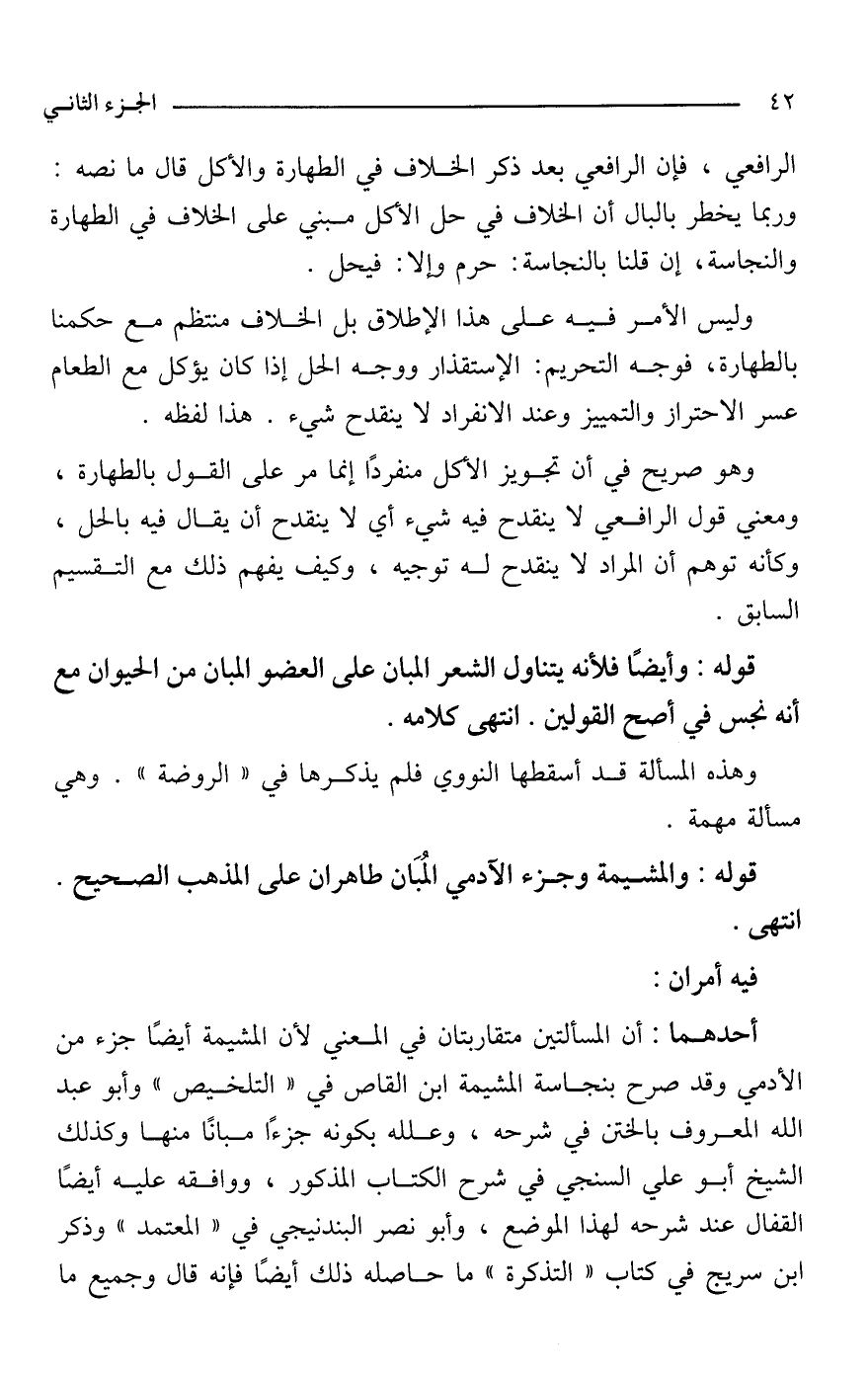 الرافعي، فإن الرافعي بعد ذكر الخلاف في الطهارة والأكل قال ما نصه: وربما يخطر بالبال أن الخلاف في حل الأكل مبنى على الخلاف فى الطهارة والنجاسة، إن قلنا بالنجاسة: حرم وإلا: فيحل.