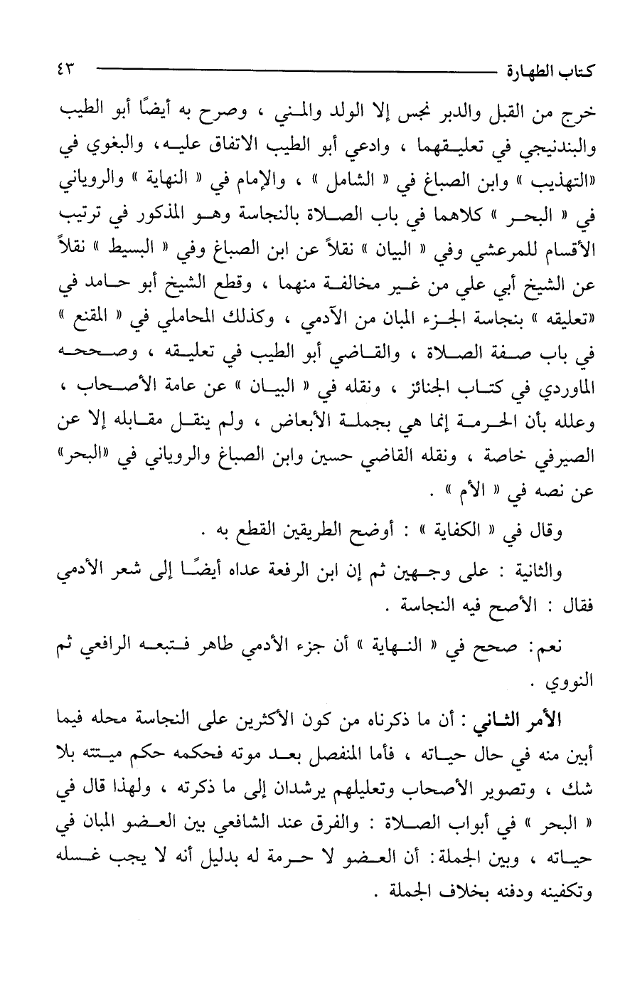 خرج من القبل والدبر نجس إلا الولد والمني، وصرح به أيضًا أبو الطيب والبندنيجي في تعليقهما، وادعي أبو الطيب الاتفاق عليه، والبغوي في "التهذيب" وابن الصباغ في "الشامل"، والإمام في "النهاية" والروياني في "البحر" كلاهما في باب الصلاة بالنجاسة وهو المذكور في ترتيب الأقسام للمرعشي وفي "البيان" نقلًا عن ابن الصباغ وفي "البسيط" نقلًا عن الشيخ أبي علي من غير مخالفة منهما، وقطع الشيخ أبو حامد في "تعليقه" بنجاسة الجزء المبان من الآدمي، وكذلك المحاملي في "المقنع" في باب صفة الصلاة، والقاضي أبو الطيب في تعليقه، وصححه الماوردي في كتاب الجنائز، ونقله في "البيان" عن عامة الأصحاب، وعلله بأن الحرمة إنما هي بجملة الأبعاض، ولم ينقل مقابله إلا عن الصيرفي خاصة، ونقله القاضي حسين وابن الصباغ والروياني في "البحر" عن نصه في "الأم".