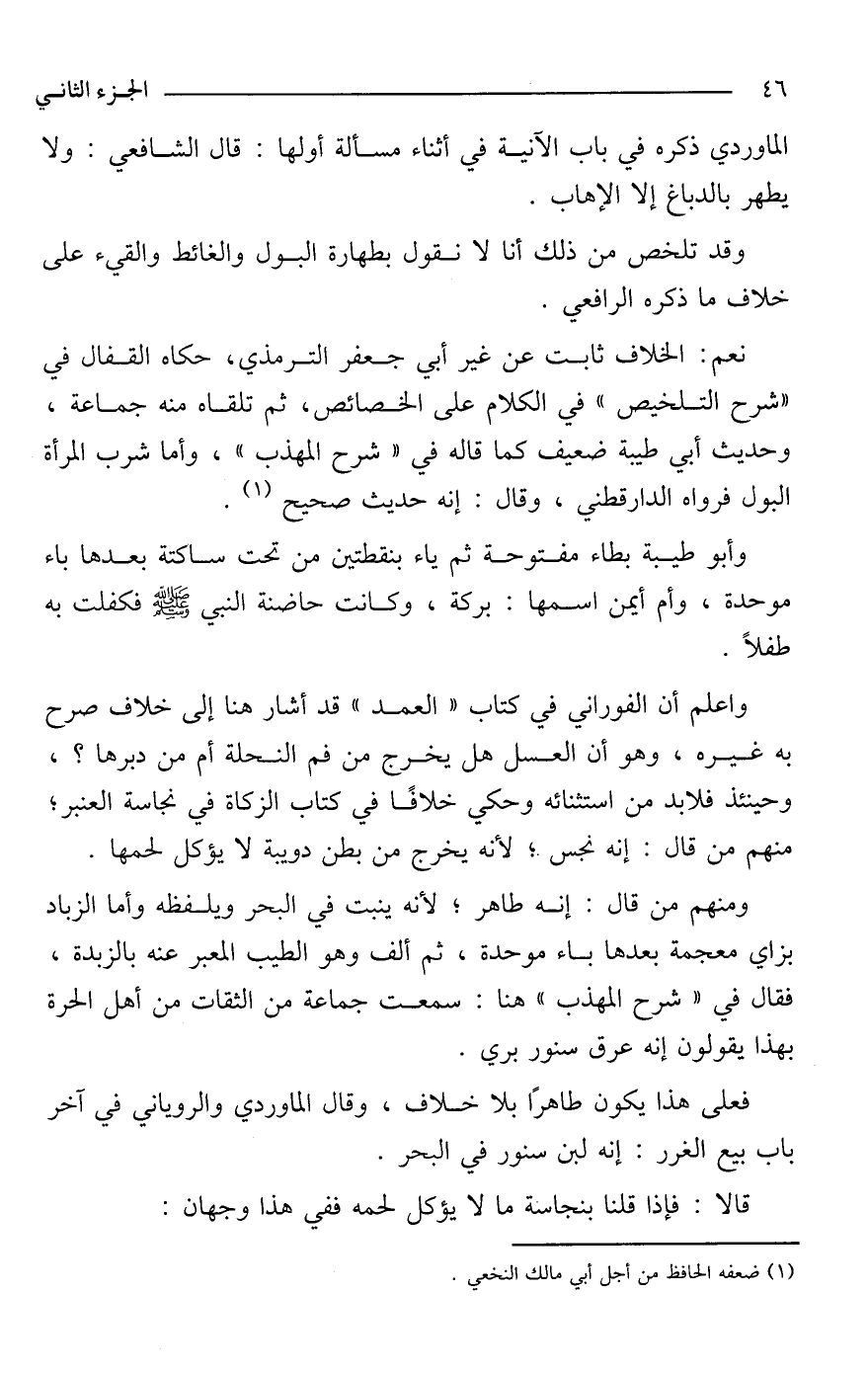 واعلم أن الفوراني في كتاب "العمد" قد أشار هنا إلى خلاف صرح به غيره، وهو أن العسل هل يخرج من فم النحلة أم من دبرها؟ ، وحينئذ فلابد من استثنائه وحكي خلافًا في كتاب الزكاة في نجاسة العنبر؛ منهم من قال: إنه نجس؛ لأنه يخرج من بطن دويبة لا يؤكل لحمها.