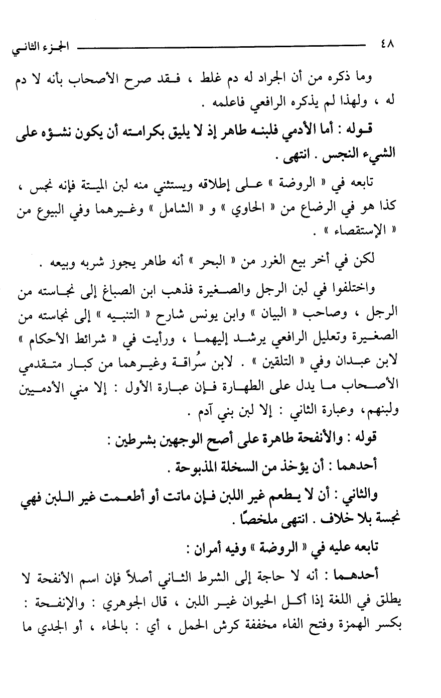 أحدهما: أنه لا حاجة إلى الشرط الثاني أصلًا فإن اسم الأنفحة لا يطلق في اللغة إذا أكل الحيوان غير اللبن، قال الجوهري: والإنفحة: بكسر الهمزة وفتح الفاء مخففة كرش الحمل، أي: بالحاء، أو الجدي ما