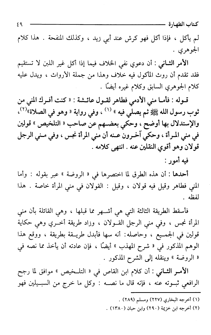 قوله: فأما مني الأدمي فطاهر لقول عائشة: "كنت أفرك المني من ثوب رسول الله - صَلَّى اللَّهُ عَلَيْهِ وَسَلَّمَ - ثم يصلي فيه" (¬1)، وفي رواية "وهو في الصلاة" (¬2)، والإستدلال بها أوضح، وحكي بعضهم عن صاحب "التلخيص" قولين في مني المرأة، وحكي آخرون عنه أن مني المرأة نجس، وفي مني الرجل قولان وهو أقوي النقلين عنه. انتهى كلامه.