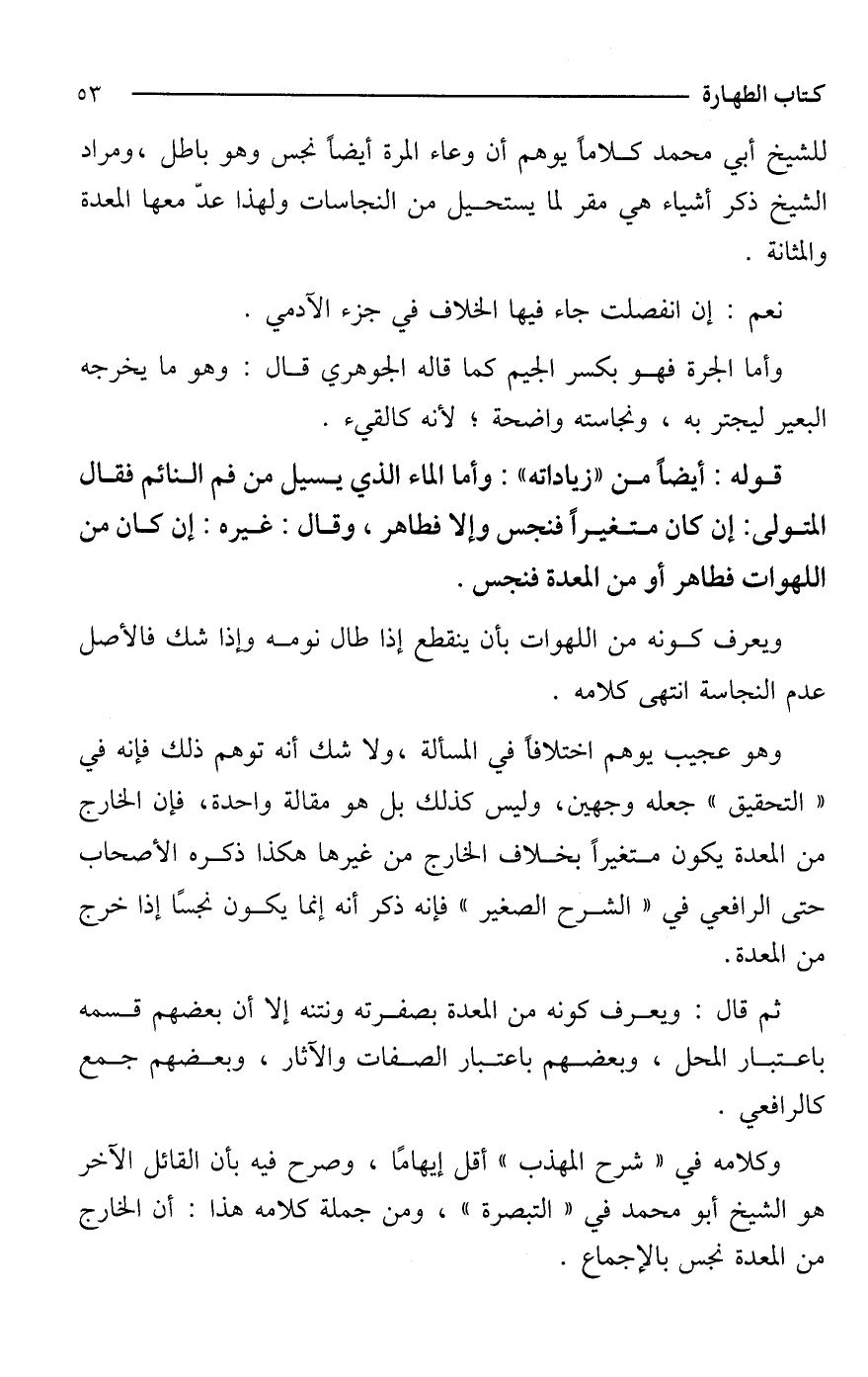 للشيخ أبي محمد كلامًا يوهم أن وعاء المرة أيضًا نجس وهو باطل، ومراد الشيخ ذكر أشياء هي مقر لما يستحيل من النجاسات ولهذا عدّ معها المعدة والمثانة.
