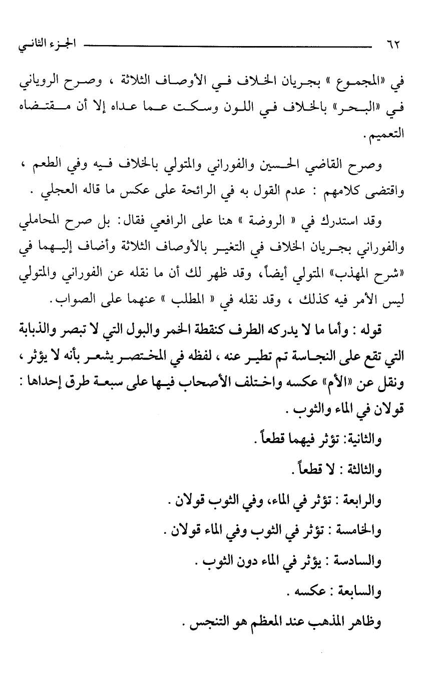 وقد استدرك في "الروضة" هنا على الرافعي فقال: بل صرح المحاملي والفوراني بجريان الخلاف في التغير بالأوصاف الثلاثة وأضاف إليهما في "شرح المهذب" المتولي أيضًا، وقد ظهر لك أن ما نقله عن الفوراني والمتولي ليس الأمر فيه كذلك، وقد نقله في "المطلب" عنهما على الصواب.